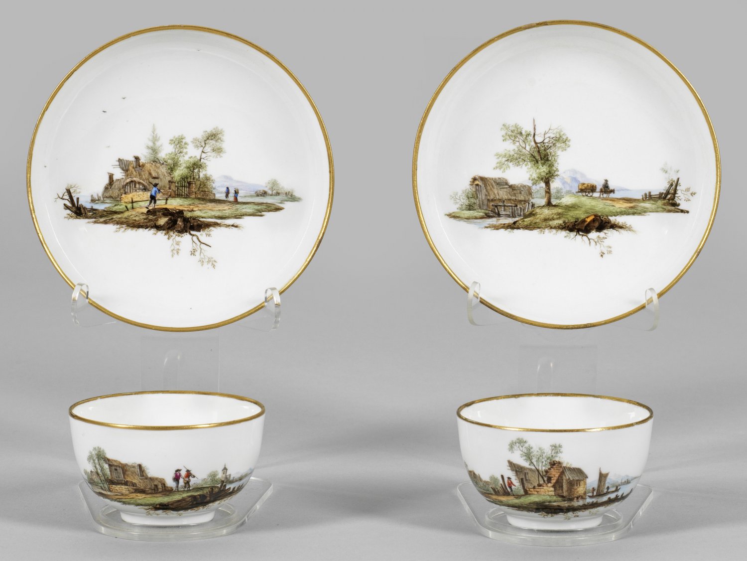 auf Untertassen. Halbkugeliger Korpus mit gebogtem Henkel. Auf der Schauseite und im Spiegel weite Landschaftsszenerien mit Figurenstaffage im sog. Inselstil, im Spiegel der Tasse farbenprächtiges Blumengebinde in polychromer Malerei. Goldrand. Schwertermarke. H. 4,5 cm.