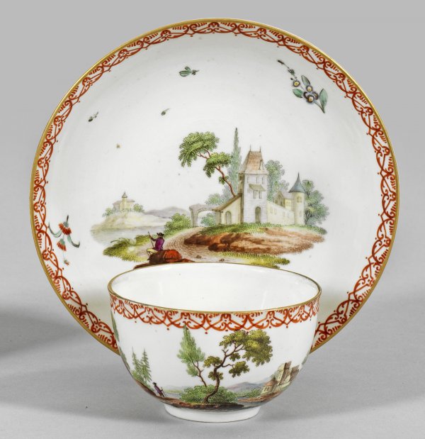 auf Unterschale. Halbkugeliger Korpus mit Ohrenhenkel. Auf der Wandung und im Spiegel Flusslandschaften mit imposanter Architektur und Figurenstaffage, umgeben von gestreuten Blumen in polychromer Malerei. Umlaufende, eisenrote Ornamentbordüre. Goldrand. Manufakturmarke. H. 4,5 cm.