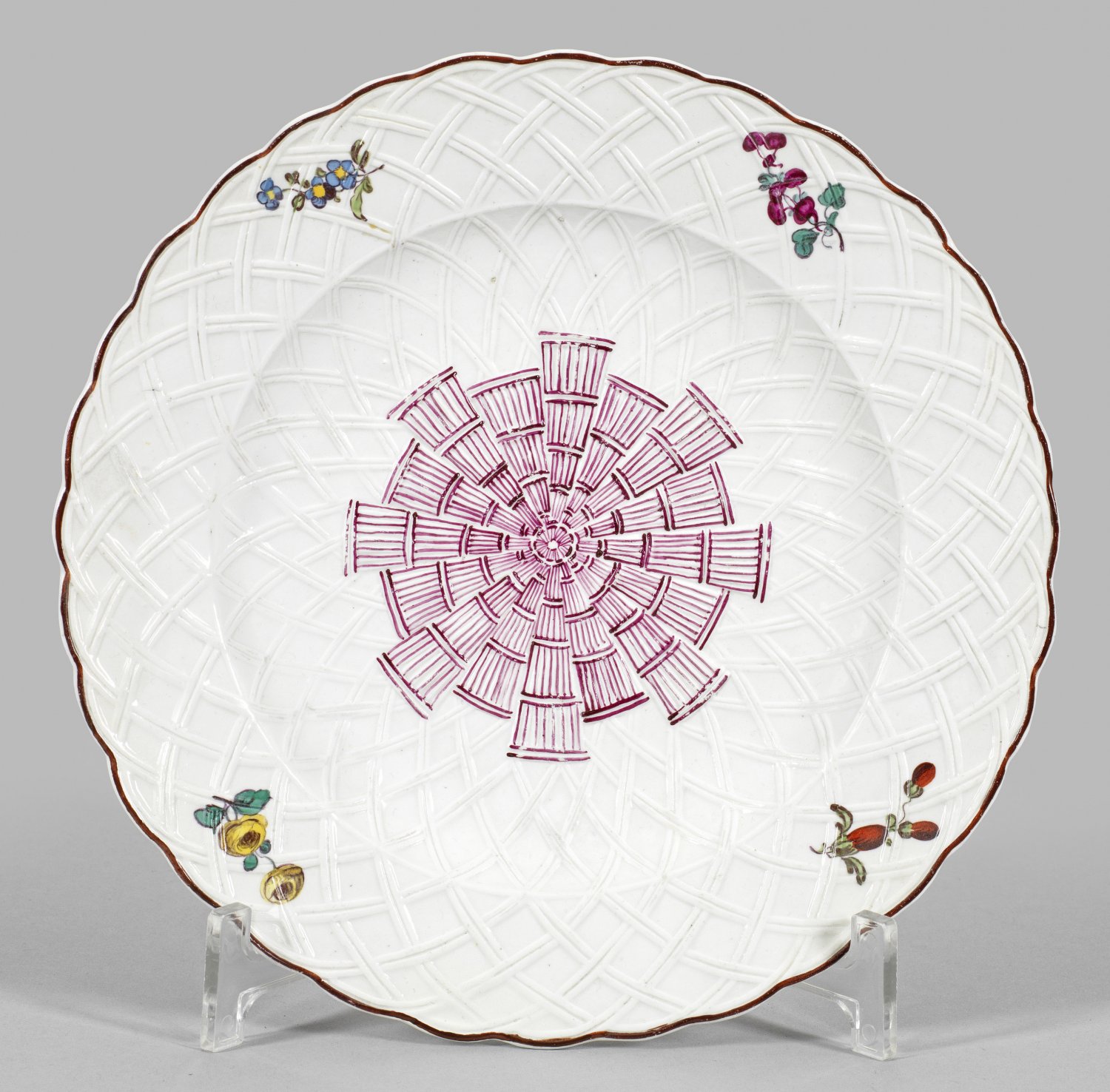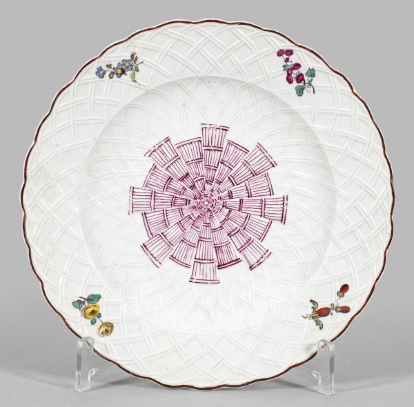 Runde Form mit passigem Rand. Flächendeckendes Geflechtrelief, im vertieften Spiegel davon ausgesparte, reliefierte, neunspeichige Radrosette in Purpur-Staffierung. Auf der Fahne farbige Blütenzweige in polychromer Malerei. Manufakturmarke. D. 22 cm.