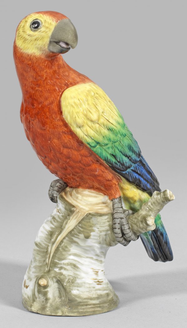 Auf einem hohen Stamm nach rechts sitzender Papagei, den Kopf seitlich gewandt. Reliefiertes, farbenprächtiges Federkleid in leuchtendem Rot, Gelb, Grün und Blau mit gräulich-braun staffiertem Schnabel. Polychrome Malerei. Entw. wohl Johann Baptist Pedrozzi. Zeptermarke. H. 22 cm.