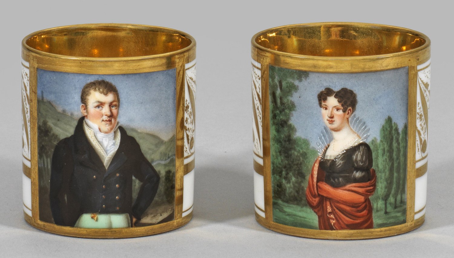 Gegenstücke. Zylinderförmiger Korpus mit Ohrenhenkel. Schauseitige, goldkonturierte Reserve mit Porträt eines Herrn bzw. einer Dame vor angedeuteter Landschaftskulisse, wohl eines Ehepaares. Rückseitig feines Golddekorband. Innenwandvergoldung. Bekröntes, ligiertes FR (Fridericus Rex) in Aufglasurrot als Manufakturmarke. H. 6,5 cm.