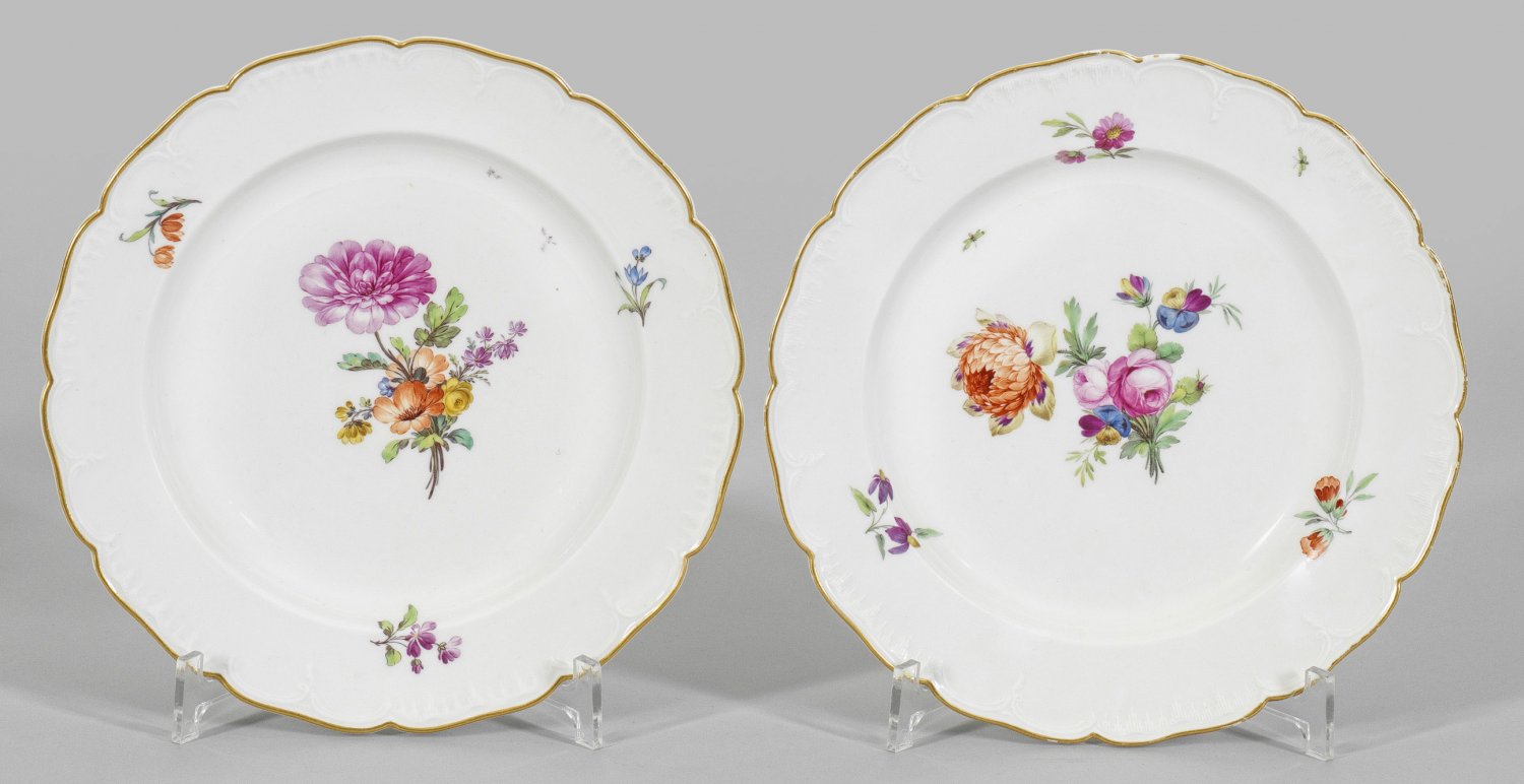A pair of porcelain plates with flower decor. Golden rim partly rubbed. Sceptre mark.