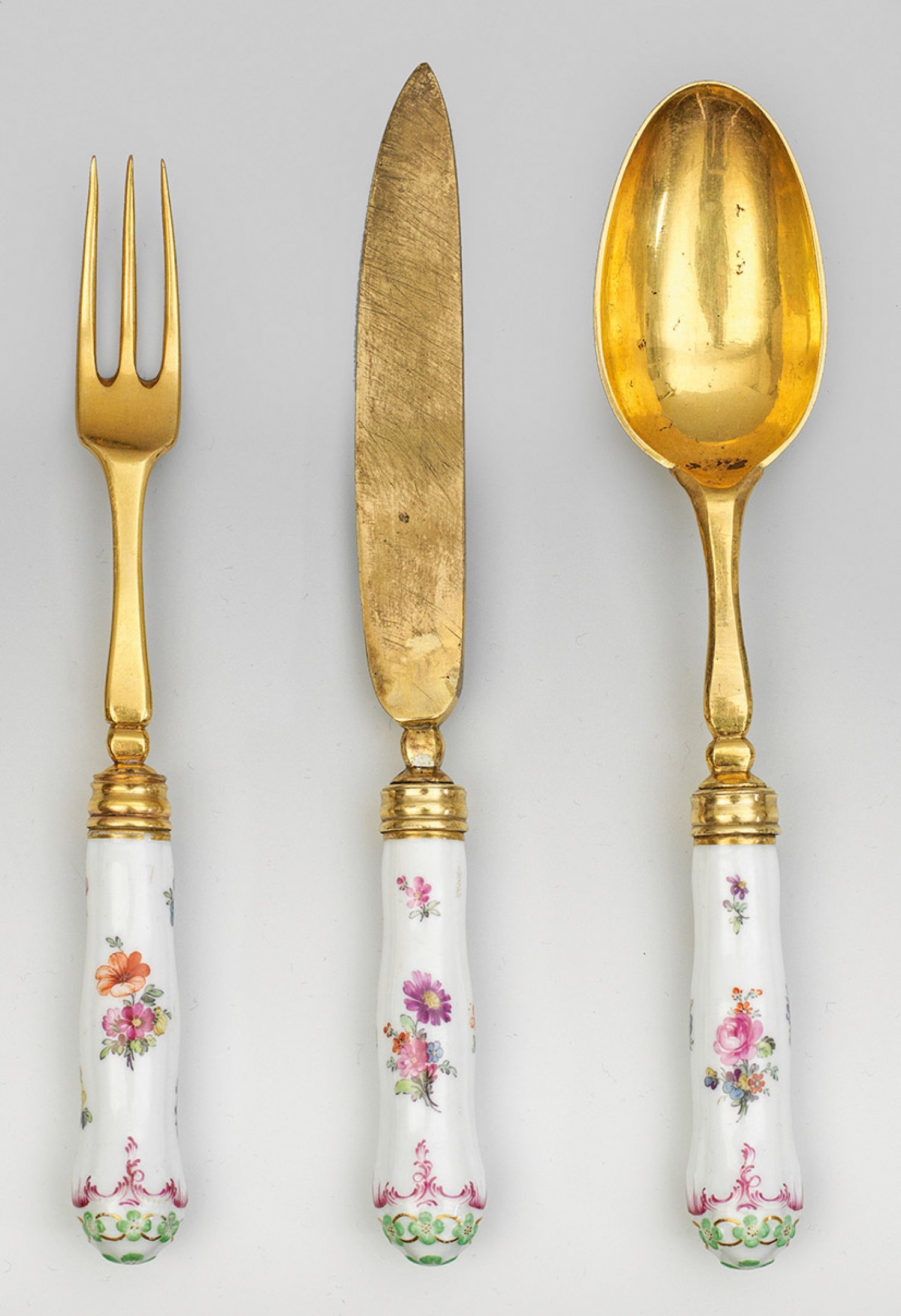 3-tlg.; Messer, Gabel und Löffel. Balusterförmiger Porzellangriff. Reliefdekor "Königsglatt" mit "natürlichen" Blumen in feiner polychromer Malerei. Goldstaffage. Messerklinge, dreizinkige Gabel, Laffe und Montierung aus feuervergoldetem Metall. L. 19 cm - 21 cm.
