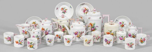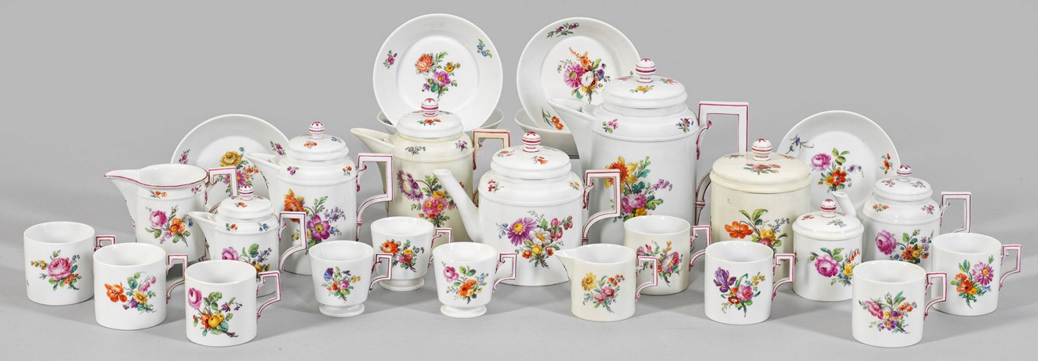 19-tlg.; Kaffee-, Tee-, 2 Mokkakannen, 4 Sahnegießer, Zuckerdose, 6 Kaffeetassen mit Untertassen, 3 Mokkatassen, Gebäckdose. "Antikglatt". Feine Blumenbuketts in polychromer Malerei. Teilw. rep./rest./best.; Haarriss. Zeptermarke. Kannen-H. 10 cm - 19 cm.