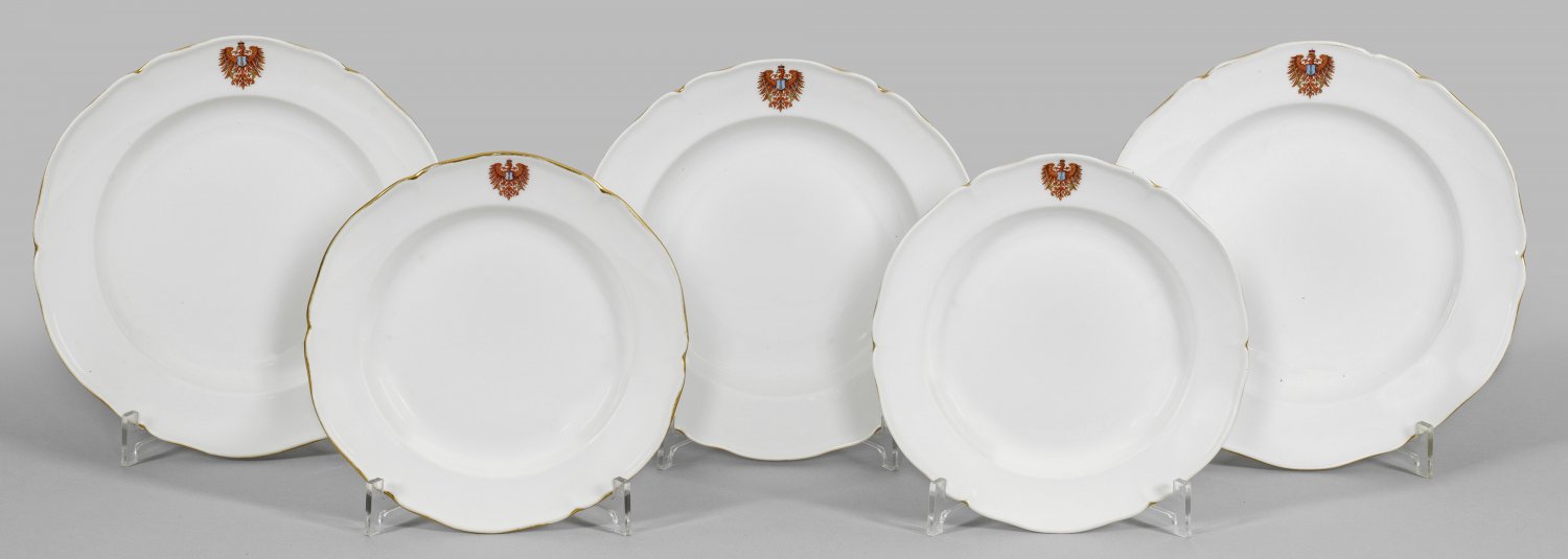 2 Speise-, 2 Dessert- und ein Suppenteller. Auf der Fahne das Wappen der preußischen Provinz Brandenburg aus rotem Adler mit Kurhut, blaugrundigem Schild mit goldenem Zepter in polychromer Malerei. Ber. Goldrand. Zepter- und Malereimarke. D. 21 cm - 23,5 cm.