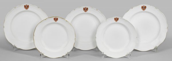 A collection of five early 20th C. porcelain plates from a dinner set with coat of arms of the Prussian province of Brandenburg. Rubbed gold rim. Sceptre and painter's mark.