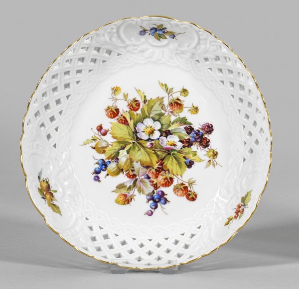 Runde Form. Korbgeflechtartig durchbrochen gearbeitete Wandung mit alternierend reliefierten Rocaillekartuschen, darin verschiedene Beerenzweige. Im Spiegel farbenprächtiges Arrangement aus Erd-, Brom-, Heidel- sowie Stachelbeeren. Feine polychrome Malerei in kräftigen Farben. Goldrand. Schwertermarke. D. 21 cm.