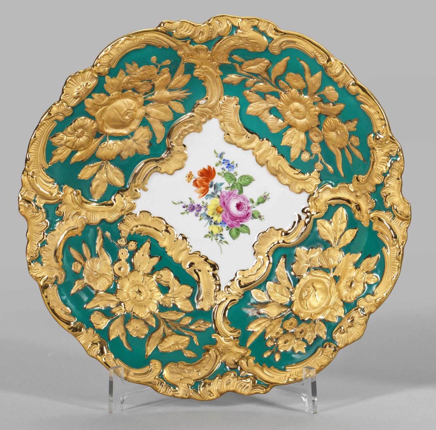 Runde, gemuldete Form. Petrolgrüner Fond mit reliefierten Rocaillereserven und Blumenbuketts in sog. Goldbronze. Im Spiegel farbiges Blumengebinde in polychromer Malerei. Schwertermarke. D. 27 cm.