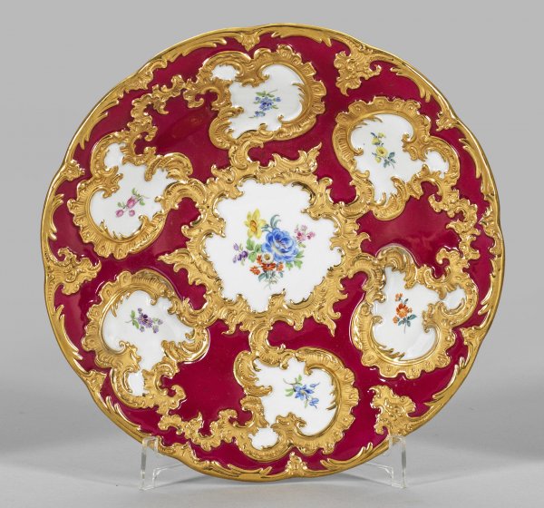 Runde, gemuldete Form. Framboisefarbener Fond mit ausgesparten, reliefierten Rocaillereserven in sog. Goldbronze. Darin farbige Blumengebinde in polychromer Malerei. Schwertermarke. D. 28 cm.