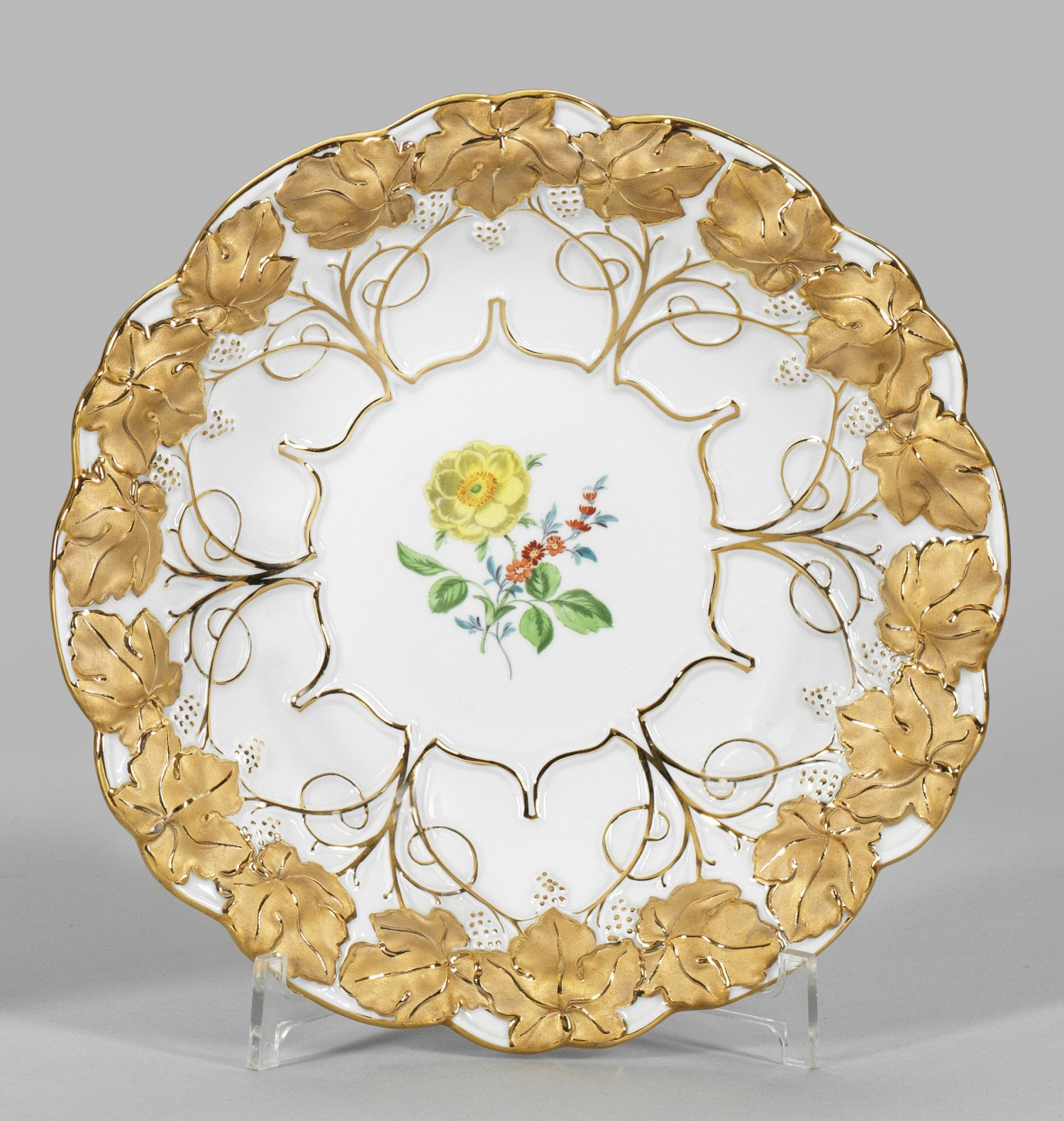 Runde, gemuldete Form. Reliefierter Weinrebendekor in sog. Goldbronze. Im Spiegel farbiges Blumengebinde in polychromer Malerei. Schwertermarke. D. 26,5 cm.