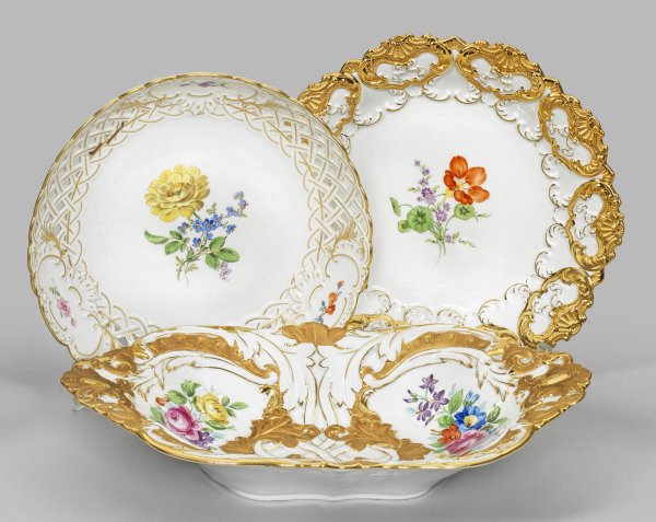Flach bis tief gemuldete Form. Teilw. korbgeflechtartig durchbrochen gearbeitet. Reliefierter, teilw. in Matt- und Glanzgold staffierter Rocailledekor mit farbenfrohen Blumenmalereien. Schwertermarke. D. 21 cm - 23 cm. 31 cm x 19 cm.