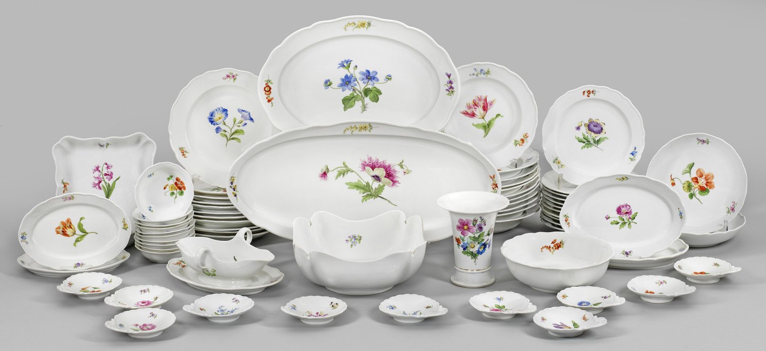 68-tlg.; 11 Suppen-, 11 Speise-, 11 Kuchenteller, 10 kleine Dessertschälchen, Fisch- und 5 Anbietplatten, 6 Beilagenschalen, Sauciere, 11 Butterschälchen, Vase. Auf der Wandung und im Spiegel große naturalistische Blumendarstellungen, umgeben von gestreuten Blütenzweigen in polychromer Malerei. Teilw. minim. best./ber.; kleine Haarrisse. Schwertermarke. Anbietplatten 15 cm - 41 cm. x 22 cm - 30 cm. Fischplatte 55 cm. x 27 cm.