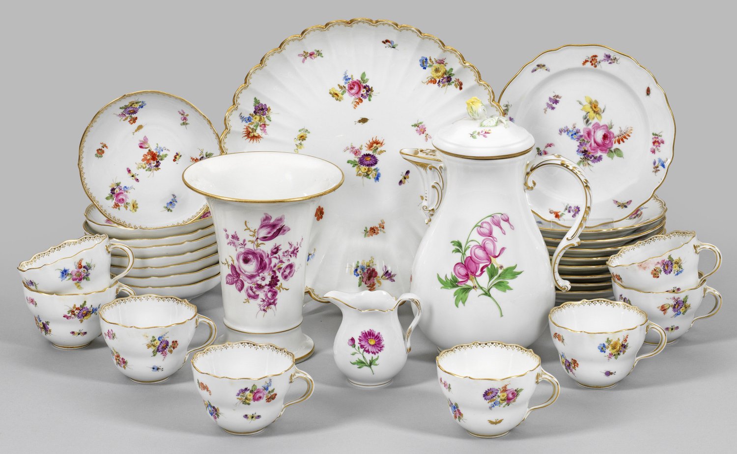 17-tlg.; 8 Kaffeetassen mit Untertassen, 8 Kuchenteller, Gebäckschale. Dekor "Gestreute Bukettchen mit Insekten" in polychromer Malerei. Reiche Goldstaffage. Goldornamentbordüre, sog. Wiener Kante. Beigabe: Kaffeekanne, Sahnegießer und Vase mit "Deutsche Blume", teilw. in Purpur-Camaieu. Teilw. best./besch.; Schwertermarke. Kannen-H. 25 cm. Vasen-H. 17 cm. Tortenplatten-D. 27,5 cm.