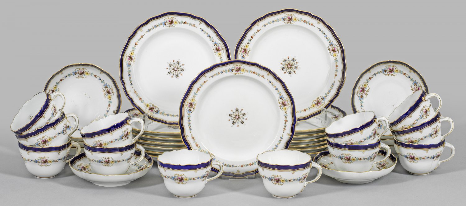 25-tlg.; 10 Kaffeetassen mit Untertassen, 15 Kuchenteller. Geschweifte Form. Kobaltblauer Rand. Stilisierter Dekor aus farbiger, sternförmiger Blütenrosette im Spiegel und Blumengirlanden auf der Fahne. Polychrome Malerei mit reichem Golddekor. Beigabe: 2 korrespondierende Kaffeetassen. Teilw. best./Haarriss. Schwertermarke. Teller-D. 19,5 cm.