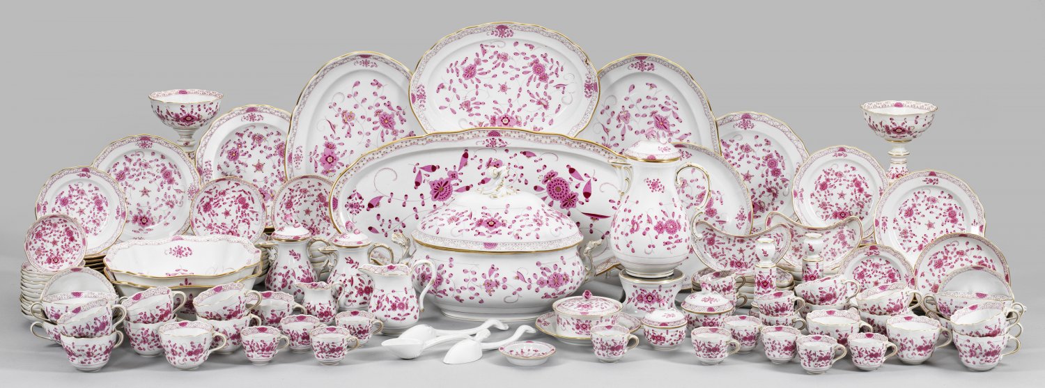 für 6 Personen. 123-tlg.; Kaffee-, 2 Mokkakannen, 2 Sahnegießer, 2 Zuckerdosen, 14 Mokka-, 16 Kaffeetassen mit Untertassen, 6 Suppentassen, 6 Suppen-, 6 Speise-, 6 Vorspeisen-, 6 Kuchen-, 12 Dessert-, 13 Brot-, 2 Konfektteller, Deckelterrine, Fisch- und 3 Anbietplatten, Gebäck- und 2 Beilagen-, 13 Gräten-, 2 Konfektfußschalen, Butterdose, Stövchen, Ascher, 2 Kerzenhalter. Indianischer Blumendekor in purpurfarbener goldgehöhter Camaieumalerei. Goldrand. Beigabe: 3 Weißporzellan-Schöpflöffel. Teilw. Haarriss. Minim. best./ber.; Schwertmarke. Platten 60,5 cm. x 28,5 cm. Terrinen- H. 26 cm.