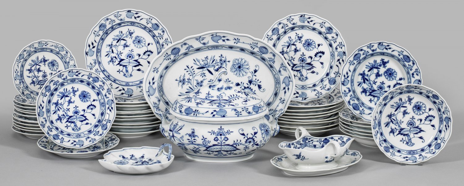 44-tlg.; 19 Speise-, 2 Vorspeisen-, 6 Suppen-, 12 Dessertteller, Deckelterrine, Anbietplatte, Konfektschale, Sauciere, Salatschale. Zwiebelmusterdekor in unterglasurblauer Malerei. Teilw. best.; Brandfleck; Haarriss. Schwertermarke. Plattenmaße 40 cm x 29,5 cm. Terrine. 25 cm x 31 cm.
