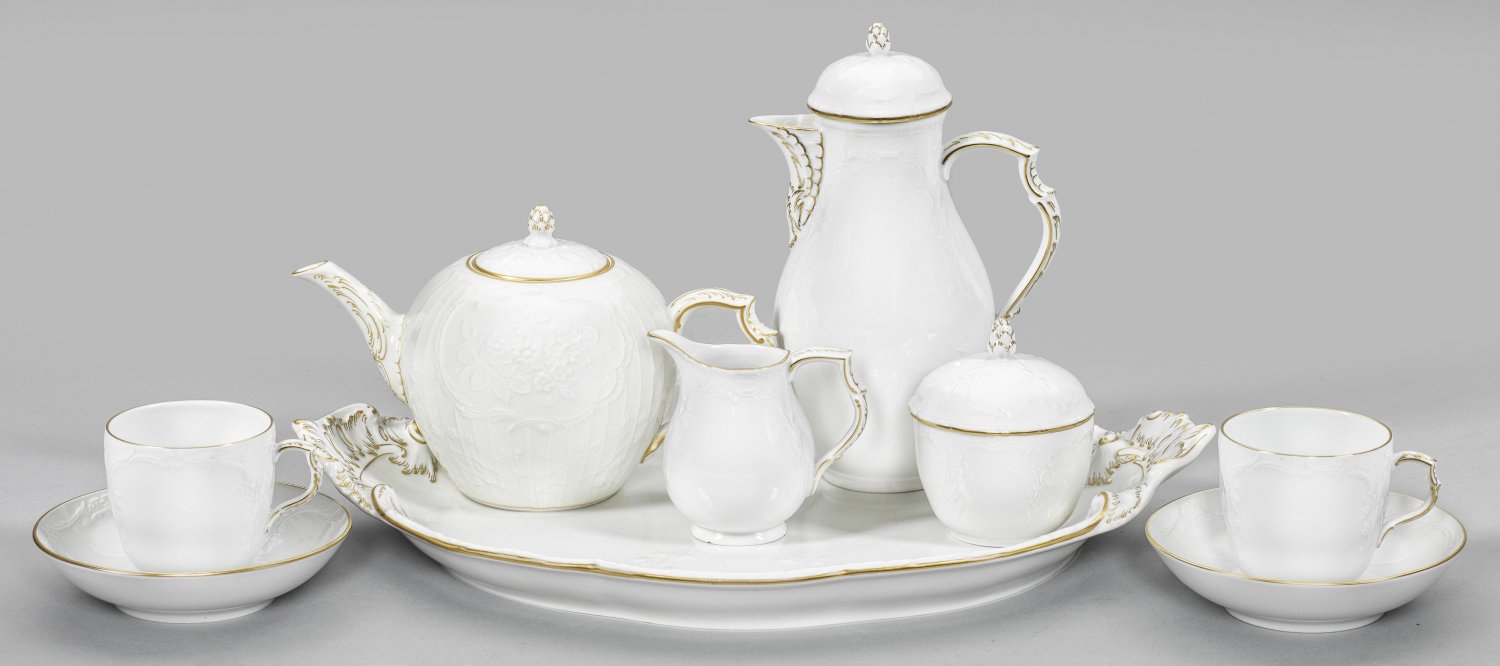 6-tlg.; Kaffeekanne, Zuckerdose, Sahnegießer, 2 Kaffeetassen mit Untertassen, Tablett. Weißporzellan mit Goldstaffage. Reliefdekor "Neuzierat". Beigabe: Teekanne mit Dekor "Reliefzierat", Anfang 20. Jh.; Zepter- und Malereimarke. Kannen-H. 23 cm. Tablett 42 cm x 32 cm.