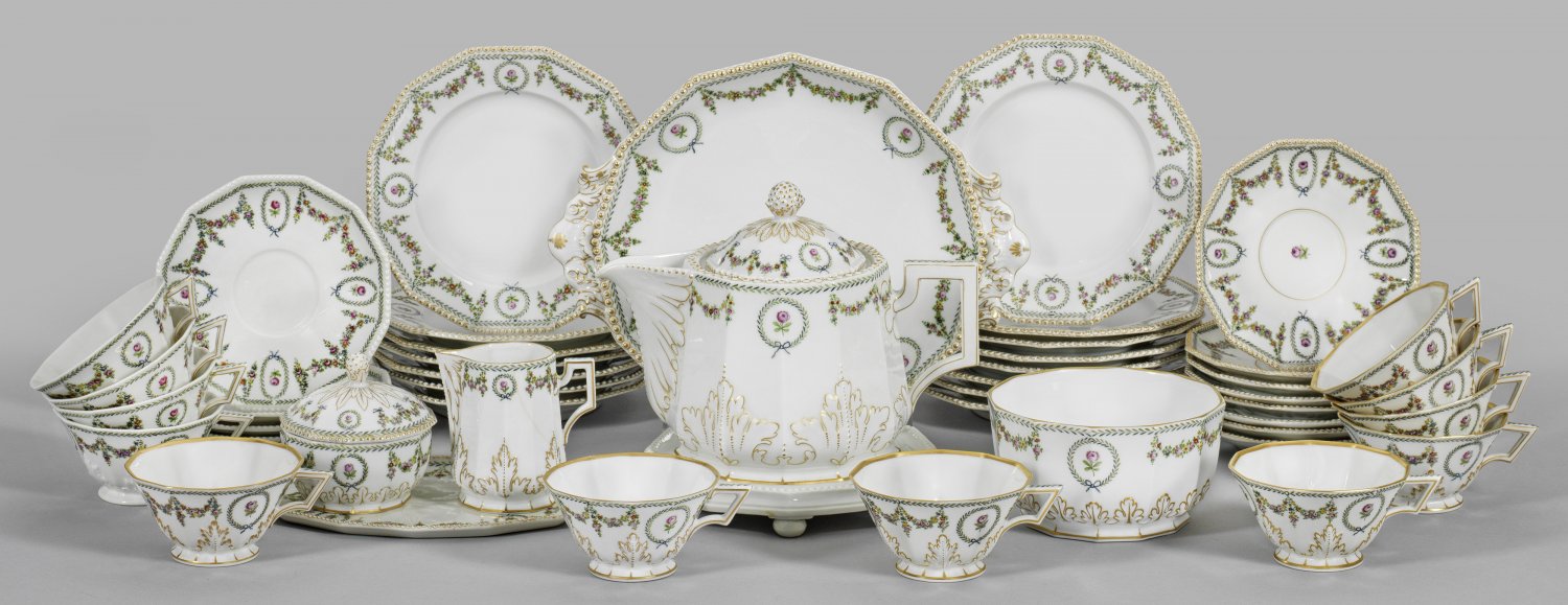 für 12 Personen. 33-tlg.; Teekanne, Sahnegießer, Zuckerdose, 12 Teetassen mit Untertassen, 15 Kuchenteller, Gebäck- und Konfektschale, kleines Tablett. Fein reliefplastisch gestaltet aus Akanthusblattfriesen und Perlrand sowie plastischen Knospenknäufen und Blatthenkel. Auf der Wandung und im Spiegel stilisierter sog. "Biedermeier"-Dekor (Nr. 1390) aus Lorbeermedaillons im Wechsel mit farbenfrohen Festonen und umlaufender Lorbeerbordüre. Polychrome Malerei mit Goldstaffage. Form-Entw. Dominikus Auliczek, um 1790. Dekor-Entw. Gustav Unger, 1903. Beigabe: korrespondierende Tasse und Weißporzellan-Kannenuntersetzer "Perl". Teilw. ohne Goldrand. Manufakturmarke. Kannen-H. 17,5 cm.