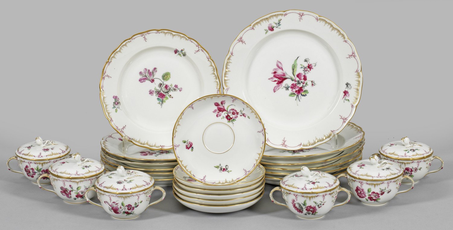 18-tlg.; 6 Vorspeisen-, 6 Speiseteller, 6 Suppentassen mit Deckel und Untertassen. Reliefdekor "Neuglatt" mit dezentem, in Purpur in Gold staffiertem Rocailledekor. Feiner Blumendekor in Dreifarbenmalerei. Teller-D. 21,5 cm - 24,5 cm.