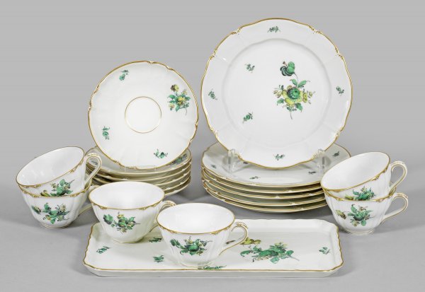 13-tlg.; 6 Kaffeetassen mit Untertassen, 6 Kuchenteller und Königskuchenplatte. Auf der Wandung und im Spiegel Blütendekor in grüner Camaieumalerei mit Goldstaffage. Manufakturmarke. Plattenmaße 31,5 cm x 15,5 cm.