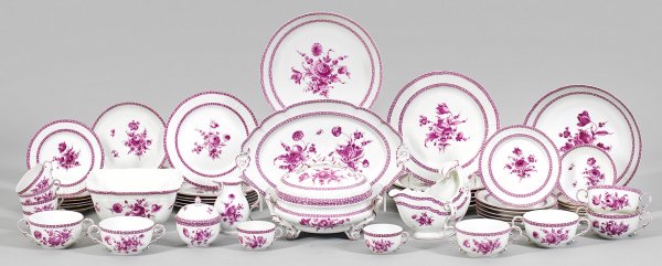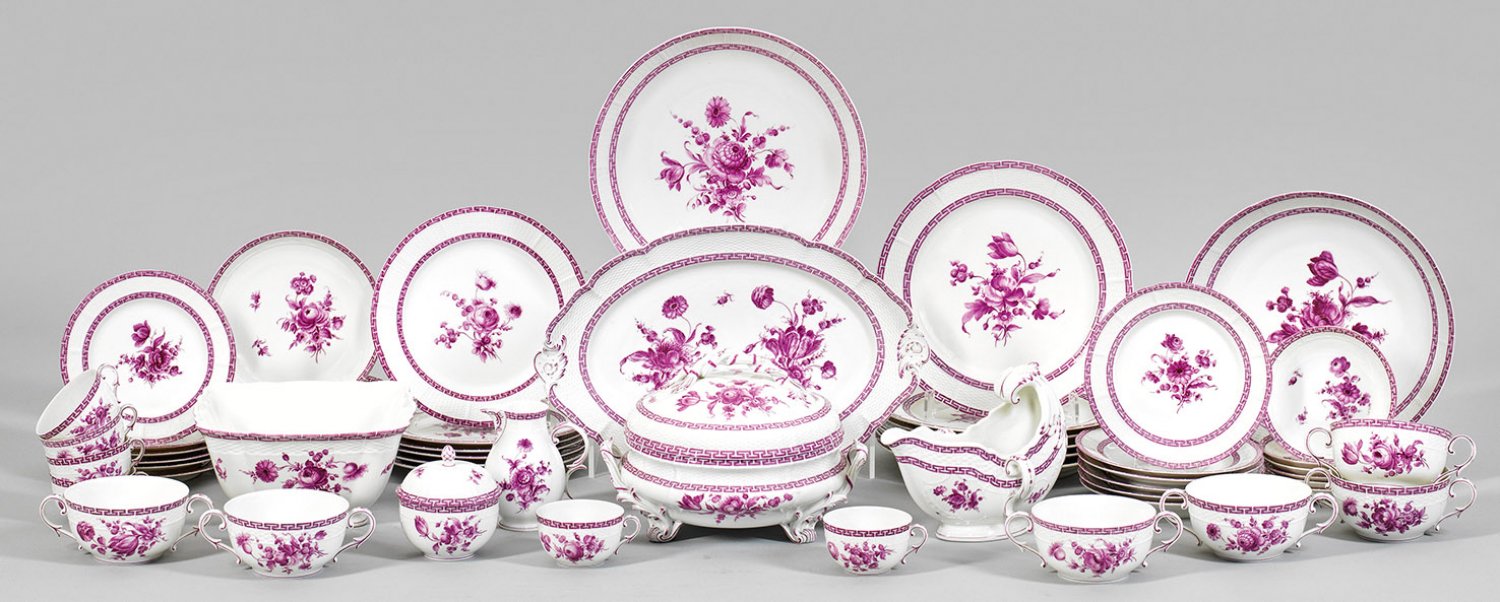 für 6 Personen. 44-tlg.; 6 Kaffee-, 6 Suppentassen mit Untertassen, Sahnegießer, Zuckerdose, 6 Kuchen-, 6 Speise-, 6 Brot-, 6 Dessertteller, Deckelterrine, Sauciere, Anbietplatte, 3 Beilagenschalen. Reliefdekor "Ozier" sowie reliefplastischer Dekor aus Blattvoluten und Muschelwerk. Auf der Wandung und im Spiegel feine Blumenarrangements in purpurfarbener Camaieumalerei. Umlaufende Mäanderbordüre. Manufakturmarke. Terrinen-H. 17 cm. Terrinen-D. 22 cm.