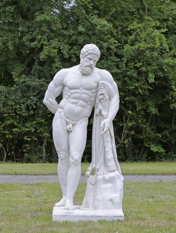 Weißer Marmor. Vollplastische Darstellung des stehenden Herkules nach seinen Heldentaten, sich auf eine Keule stützend. Auf einem Felsen das Fell des nemeischen Löwen, in seiner rechten Hand die drei Äpfel der Hesperiden. Fein ausgeführte Skulptur nach dem berühmten Marmor-Original im Nationalmuseum in Neapel, die zugleich eine der bedeutendsten Skulpturen der Antike ist. Mehr als 200 groß- und kleinformatige Nachbildungen und Variationen des "Herkules Farnese" aus römischer Zeit belegen die Berühmtheit, welche die Statue schon in der Antike hatte. 1546 wurde die Skulptur in Rom wieder entdeckt und kurz danach durch Papst Paul III. im Palazzo Farnese aufgestellt, 1787 gelangte sie nach Neapel. Die Figur wurde bereits im Palazzo Farnese zur Attraktion für die Besucher. Landgraf Karl von Hessen-Kassel sah sie während seiner Italienreise 1699/1700 und ließ nach ihrem Vorbild 1717 vom Gipfel des Karlsberges den monumentalen "Kasseler Herkules" als 8,25 m hohe Kupferkopie in Kassel aufstellen. Sogar Goethe erwähnt den "Herkules Farnese" in seiner Italienischen Reise (1786/88). Einige Jahre später erweckte die Berühmtheit des "Herkules Farnese" auch die Sammlerbegierde von Napoleons, 1799 stand sie schon zum Abtransport nach Paris bereit, was nur durch die Revolution in Neapel verhindert wurde. H. 186 cm.
