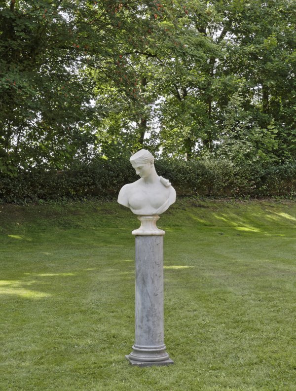 Heller, weißgrauer Stein. Auf eine Säulenplinthe komponierte, in moderner Weise torsohaft verfremdete Büste einer jungen Frau mit nach rechts in Profil gewandtem Kopf und nach unten gerichtetem Blick. Hoher Säulenpostamentsockel aus hellgrauem Marmor, ger. best.; Büsten-H. ca. 69 cm; Säulen-H. ca. 105 cm.