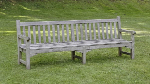 Modell Glenham. Teakholz mit witterungsbedingter Alterspatina. Gerade Zarge auf pfostenförmigen Beinen, durch gekantete Stege verbunden. Leicht geschweifte Armlehnen sowie gerade Rückenlehne mit senkrechten Streben. Firmenetikett. H. 89 cm. 236 cm x 60 cm. Sitz-H. 41 cm.