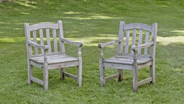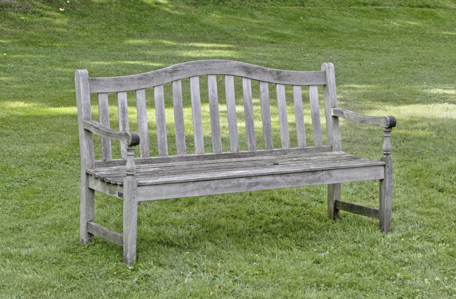 3-tlg.; Bank und zwei Armlehnsessel. Teakholz mit witterungsbedingter Alterspatina. Gerade Zarge auf pfostenförmigen Beinen, durch gekantete Stege verbunden. Balusterförmige Stützen für leicht geschweifte Armlehnen sowie mittig aufgeworfene Rückenlehne mit senkrechten Streben. Herstellerzeichen. Bank-H. 88 cm. 146 cm x 58 cm. Sitz-H. 40 cm.