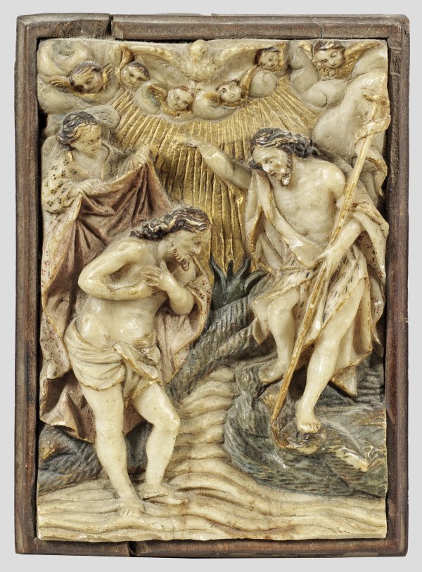 Flemish sculptor active 17th/18th C. in Mechelen (Malines). Carved, partially painted and gilt alabaster relief plaque depicting the Baptism of Jesus. Minor flaws. Mounted in old, probably original wooden frame.