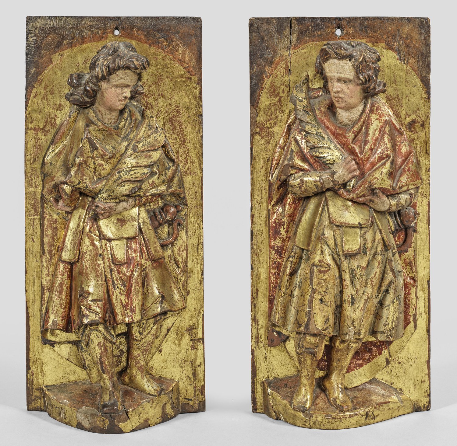 Gegenstücke. Walnuss, geschnitzt, gefasst u. vergoldet. Reliefplastische, wohl aus einem Altarensemble stammende Darstellungen. Auf einer halbrunden Plinthe stehende Heilige als junge Männer mit langem bzw. halblangem, gewelltem Haar vor einer rechteckigen Rückwand, jeweils eine Märtyrerpalme in der Hand haltend und als Pendants nach links bzw. rechts schauend. Ca. 45,5 cm x 20 cm x 9 cm.