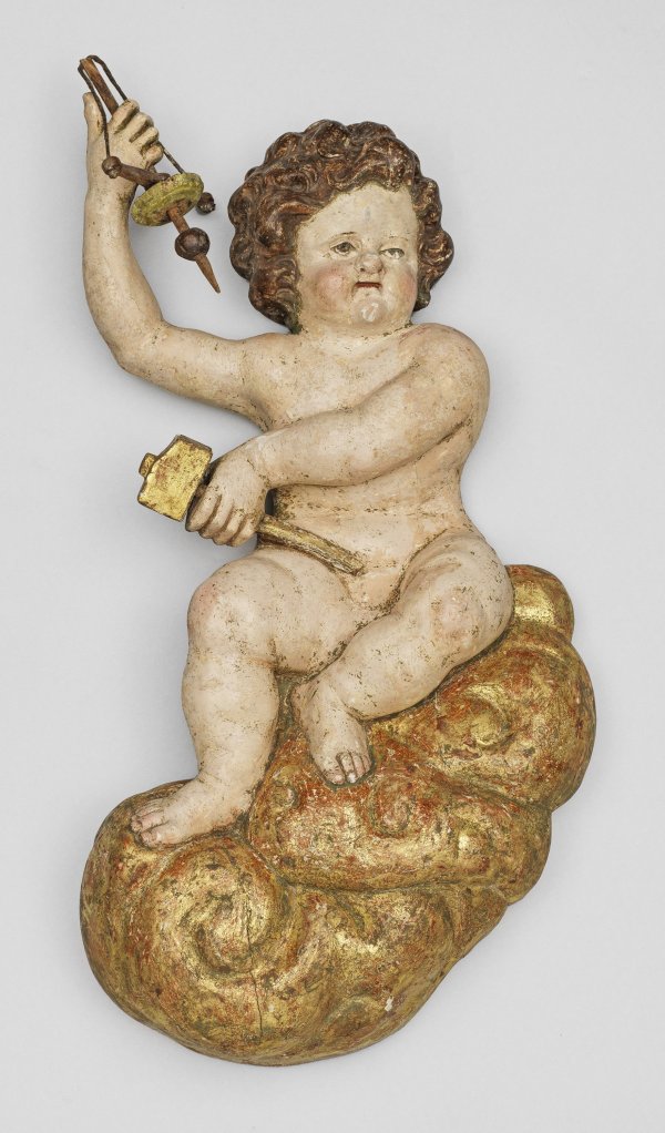 Walnuss, geschnitzt, farbig gefasst u. vergoldet. Vollplastische, rücks. abgeflachte Darstellung eines auf goldenen Wolken sitzenden Puttos mit kurzem, gewelltem Haar, Bildhauerwerkzeuge in den Händen haltend. H. ca. 66 cm.