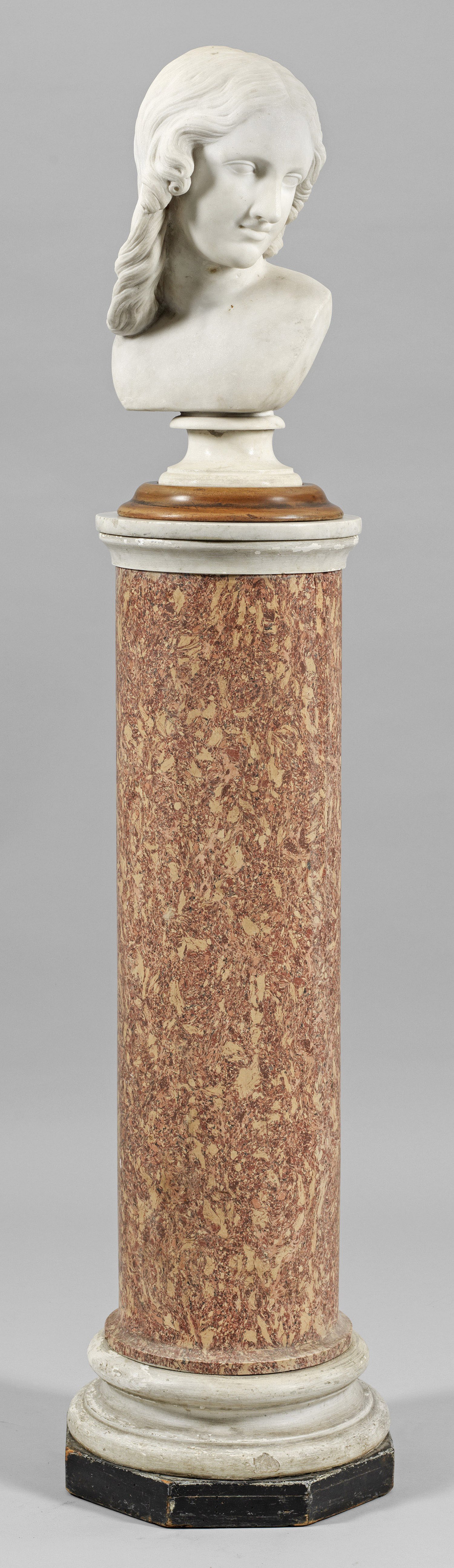 Weißer Marmor. Auf eine Säulenplinthe komponierte Büste einer jungen Frau im Profil, ihren Kopf nach links wendend und den gedankenverlorenen Blick leicht nach unten gerichtet. Künstlerisch qualitätvolle, subtil ausgeführte Skulptur, die stilistisch auf die Berliner Bildhauerschule des 19. Jhs. schließen lässt. Hohes Säulenpostament aus ebonisiertem Holz, Stuckmarmor und weißgrauer Marmor-Deckplatte, die Büste einsetzbar in eine gesonderte Nussbaumplinthe. Büsten-H. ca. 49 cm.; Säule mit Extraplinthe. H. ca. 114,5 cm.