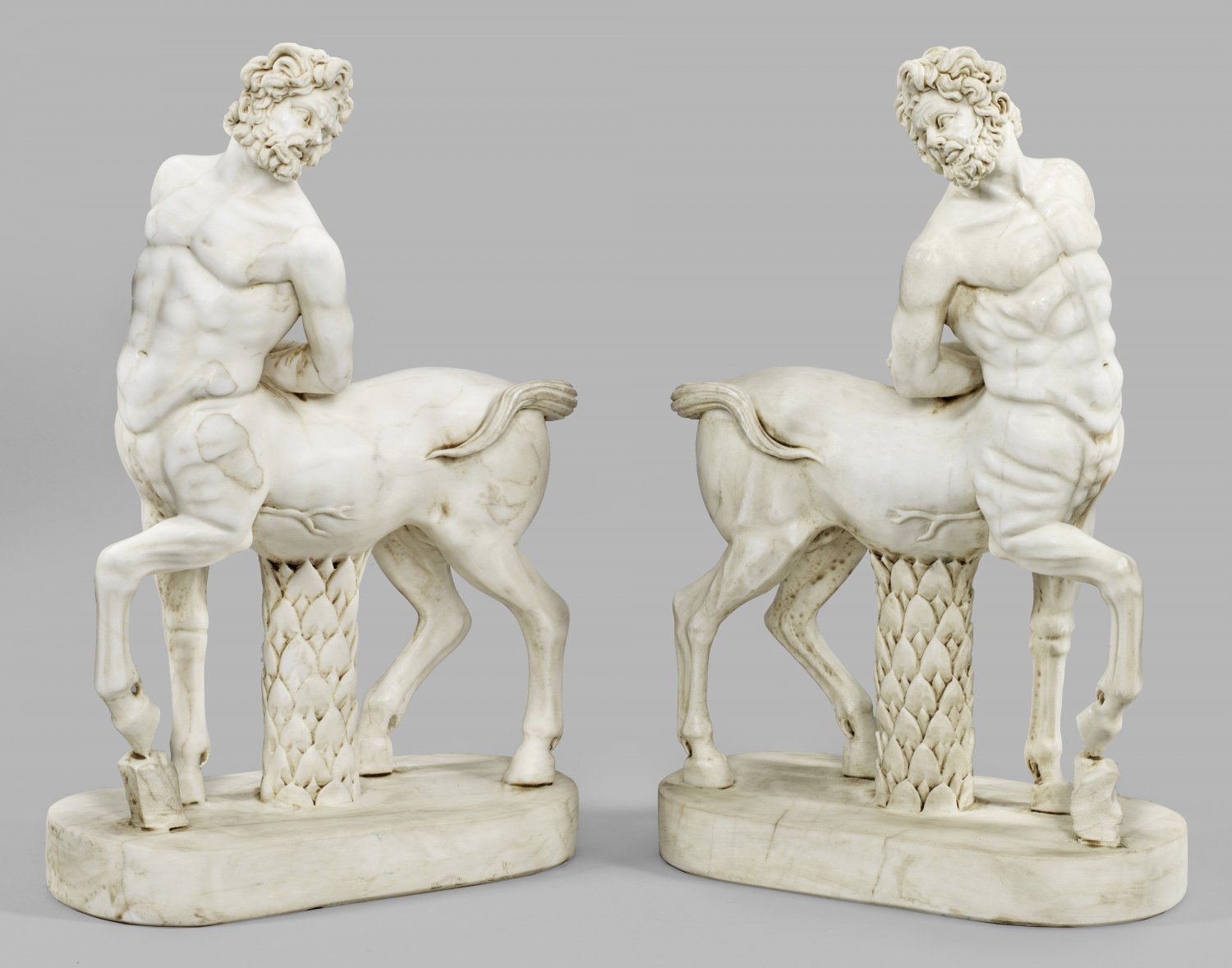 Gegenstücke. Marmorguss. Fein ausgeführte, spiegelbildlich ausgeführte Skulpturen nach der berühmten antiken römischen Marmorskulptur im Louvre. Dargestellt ist ein alter bärtiger Kentaur mit gequältem Gesichtsausdruck und hinter dem Rücken verschränkten Armen. Entstanden Ende des 1. oder Anfang des 2. Jhs. n. Chr. nach hellenistischen Vorbildern, sollte diese den römischen Betrachter an die vor Liebe gequälte Seele erinnern, was auch durch auf ihm reitenden Eros bei der Louvre-Skulptur verdeutlicht wird. Wie die vergleichbaren sog. Furietti-Kentauren gilt auch der Borghese-Kentaur, der im 17. Jh. in Rom gefunden wurde, als Meisterwerk antiker Bildhauerkunst. Aus der Borghese-Sammlung wurde er 1807 von Kaiser Napoleon erworben und gelangte so nach Paris und später in den Louvre. H. 50 cm.