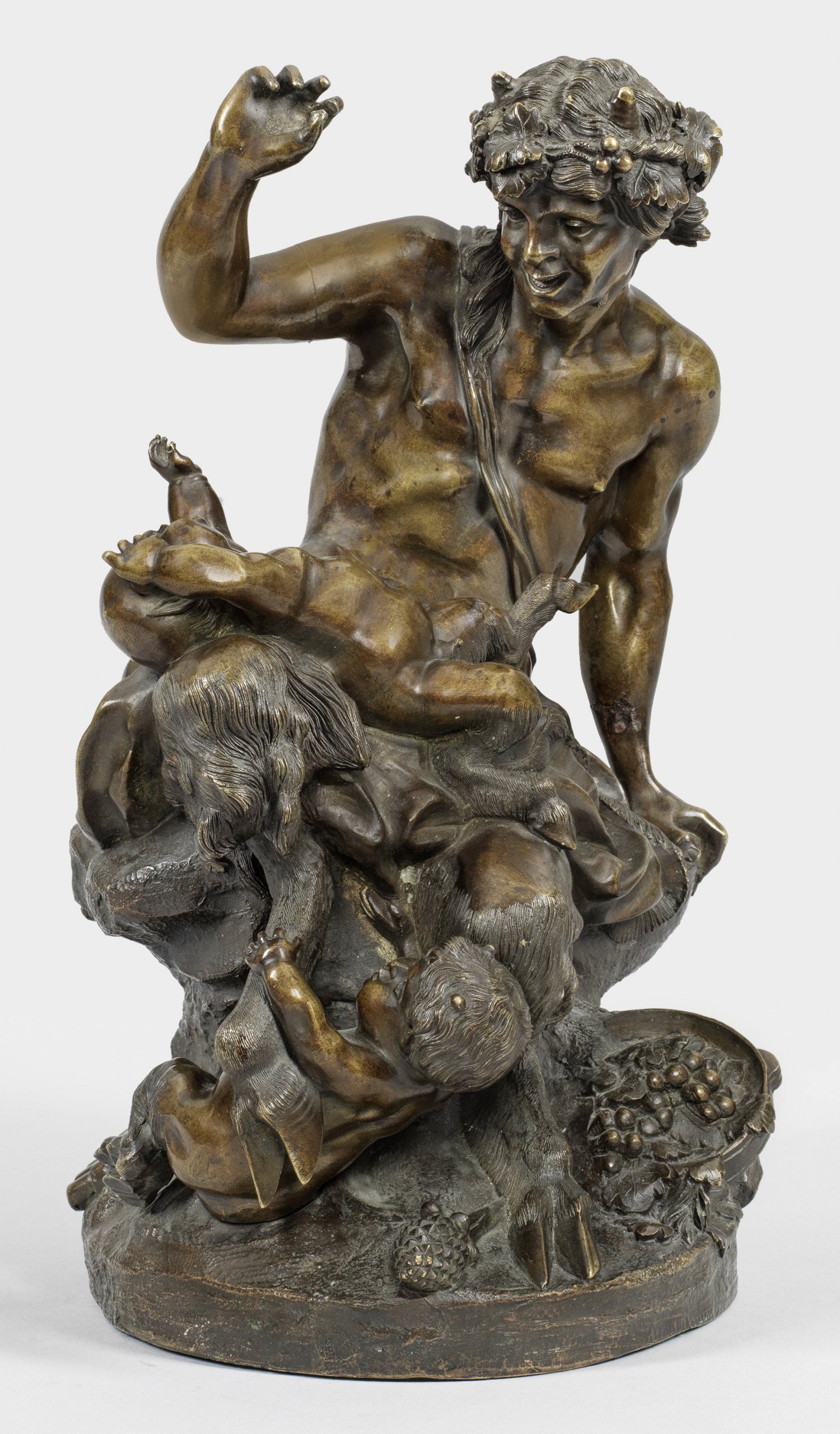 Bronze, braun patiniert. Bez.; Französischer Guss, Ende 19. Jh.; Dynamisch bewegte Gruppe mit zwei herumtollenden Faunsknaben, an der Plinthe arrangiert eine Panflöte, ein Tamburin und ein Thyrsosstab als Symbole für ein Bacchanal. Der französische Bildhauer war ein Schüler von Jean-Batiste Pigalle und arbeitete unter dem Pseudonym Clodion. Hauptsujet des für den Hof König Ludwig XVI. und vermögende Privatsammler arbeitenden Künstlers waren Faune, Nymphen, Satyrn, Putten und grazile Mädchen. H. 33 cm.