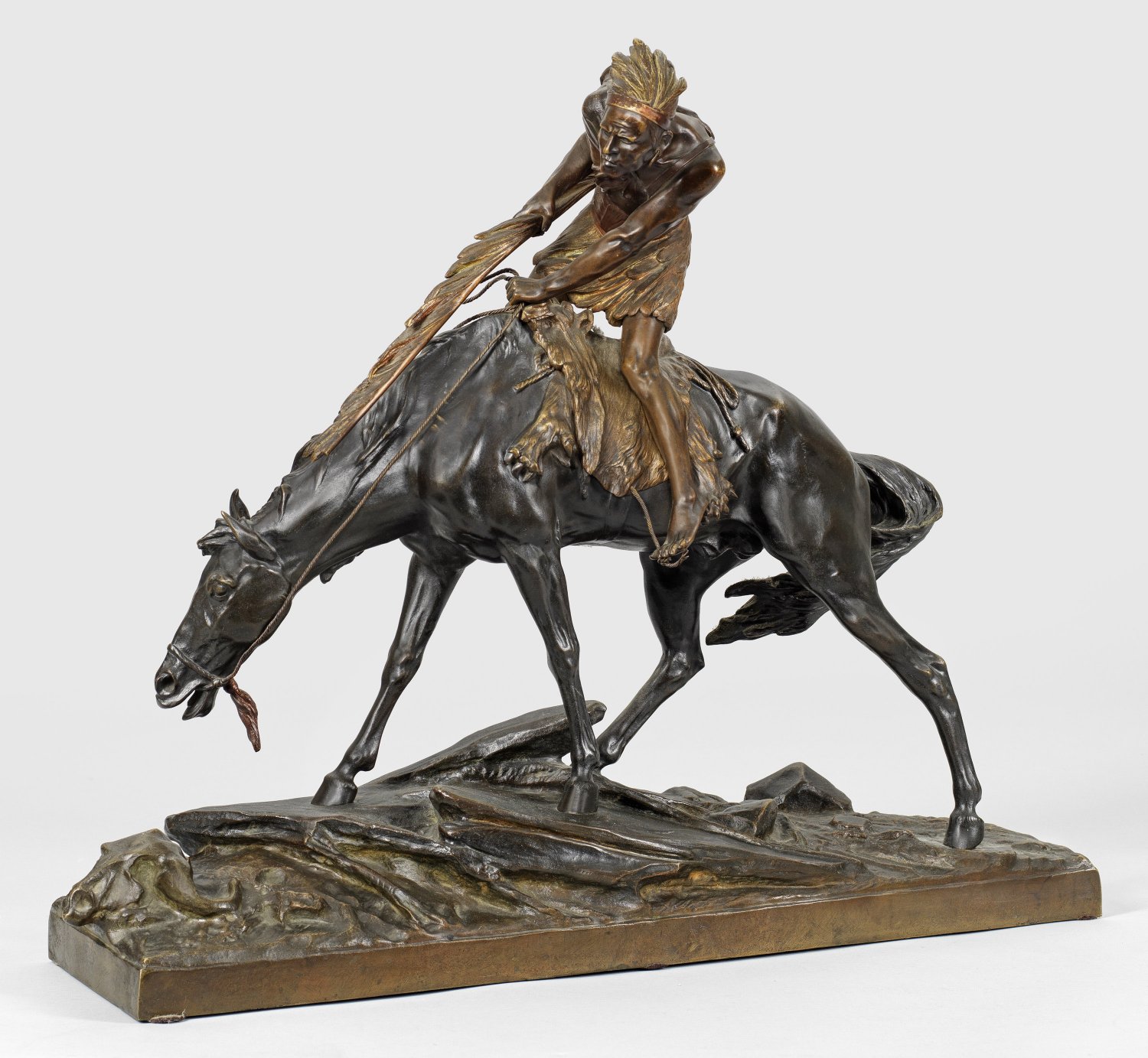Große Bronzegruppe, dunkelbraun bzw. goldbraun patiniert und partiell vergoldet. Sign.; Gießerinschrift "ETLING. PARIS.". Auf einer felsigen Naturplinthe stehendes, zum Halten gezügeltes Pferd, der nordamerikanische Prärie-Indianer als Krieger bzw. Scout in Ausschau haltender Pose oder auf dem Kriegszug. Die künstlerisch herausragende, realistische Gruppe gehört zu den bekannten Werken des französischen Bildhauers. Hierin stellte er wie seine Zeitgenossen Carl Kauba und Frederic Remington zu Anfang des 20. Jhs. den faszinierenden "Wilden Westen" dar. Drouot studierte in Paris bei den Bildhauern Émile Thomas und Mathurin Moreau an der École des Beaux-Arts. Ab 1889 stellte er regelmäßig in den Pariser Salons aus, im Jahr 1900 beteiligte er sich zudem an der Weltausstellung. H. 54 cm; B. 61 cm.