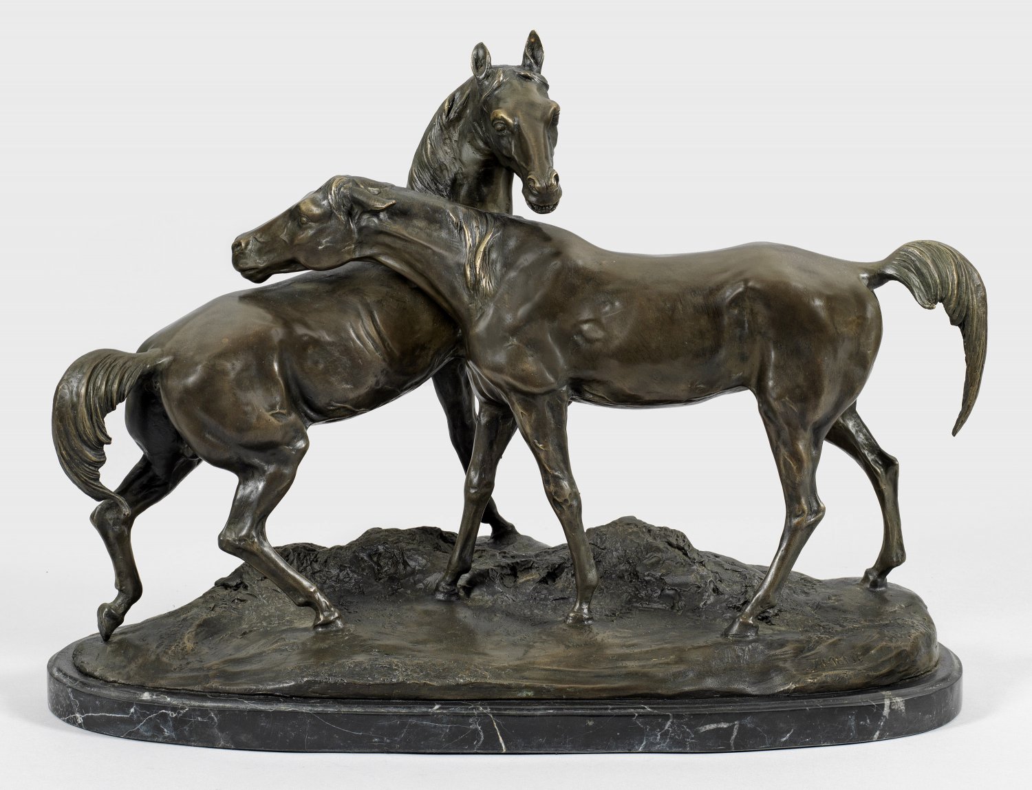 Bronze, dunkelbraun patiniert. Bez.; Schwarzer Marmorsockel. Posthumer, zeitgenössischer Guss, Ende 20./Anfang 21. Jh., nach der 1853 im Pariser Salon ausgestellten, berühmten Bronze, von der sich ein Exemplar im Louvre befindet. Die Darstellung der Liebkosung zwischen einer arabischen Stute und einem Hengst zählt zu den schönsten und erfolgreichsten Skulpturen des französischen Tierbildhauers. Ges.-H.43,5 cm; B. ca. 60 cm.