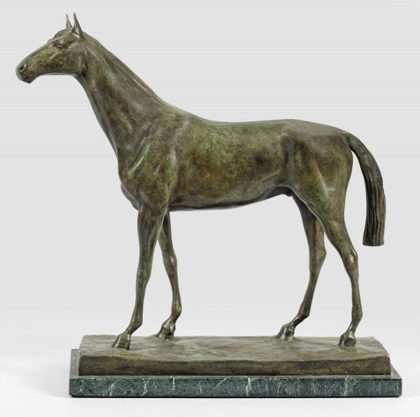 Bronze, olivfarben patiniert. Sign.; Graugrüner Marmorsockel. Ges.-H. 42 cm.
