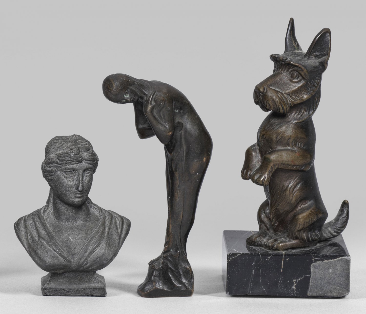 Eine antikisierende weibliche Büste aus einer Bleilegierung; ein sitzender, "Männchen machender" Terrier aus dunkelbraun patinierter Bronze auf schwarzer Marmorplinthe; eine Miniaturstatuette einer Badenden aus dunkelbraun patinierter Bronze, monogr. "WW". H. 6,7 cm-11,8 cm.