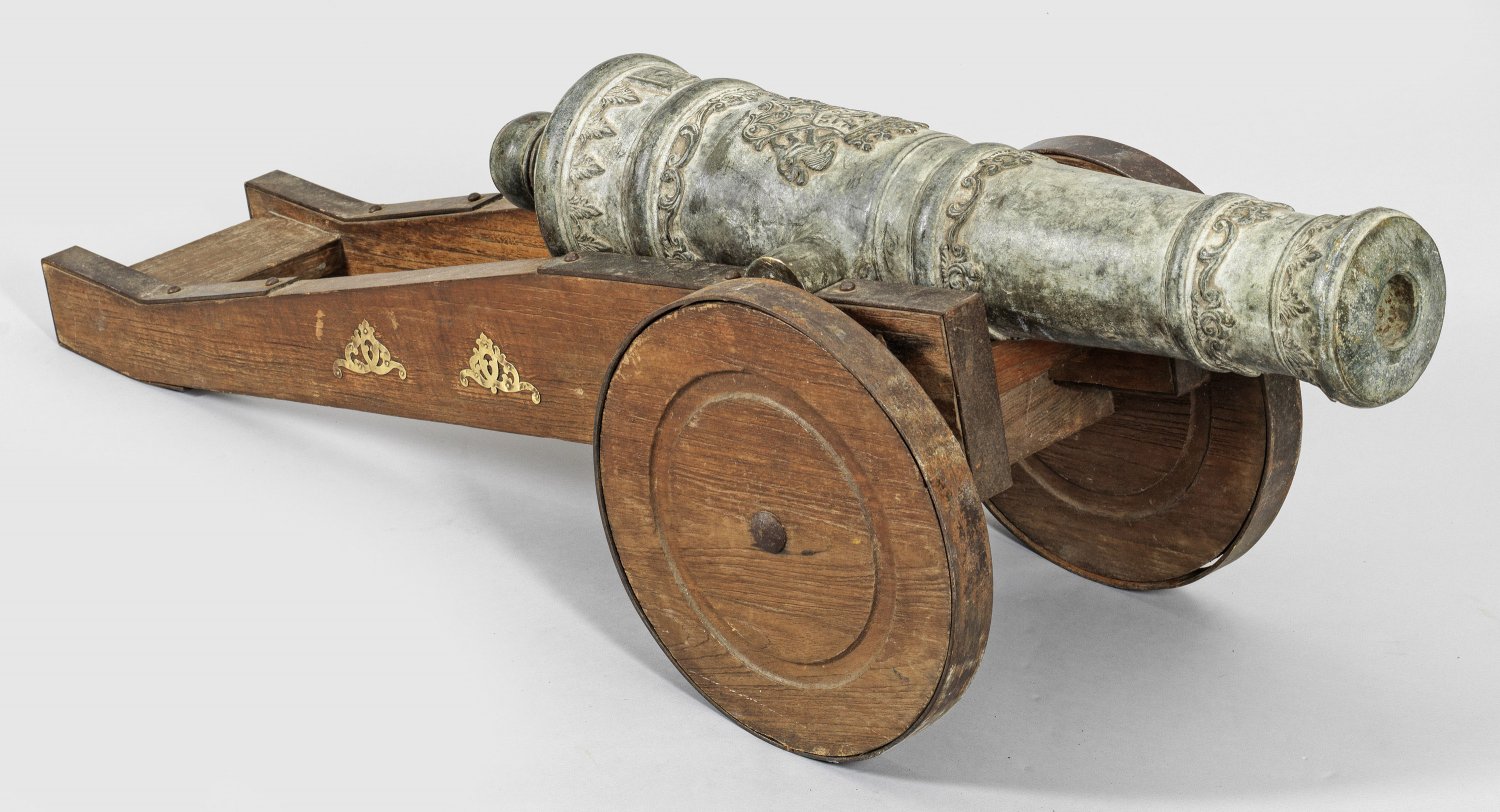 Bronze, Holz und Eisen. Hölzerne Lafette mit durchbrochen gearbeiteten Messingornamenten, Eisenbeschlägen und Nieten, auf zwei Kufen, durch Achse mit zwei ebenfalls eisenbeschlagenen und vernieteten Rädern verbunden. Mittig aufliegender, beweglicher, leicht konischer und durch mehrere Profilringe und -wulste gegliederter Kanonenlauf, verziert mit Voluten und Akanthusblättern. Zentral das reliefplastische, bekrönte Wappen der Niederländischen Ostindien-Kompanie, flankiert von zwei stehenden Löwen und dem Gründungsjahr der Handelskompanie "1602". H. 40 cm. L. 116,5 cm.