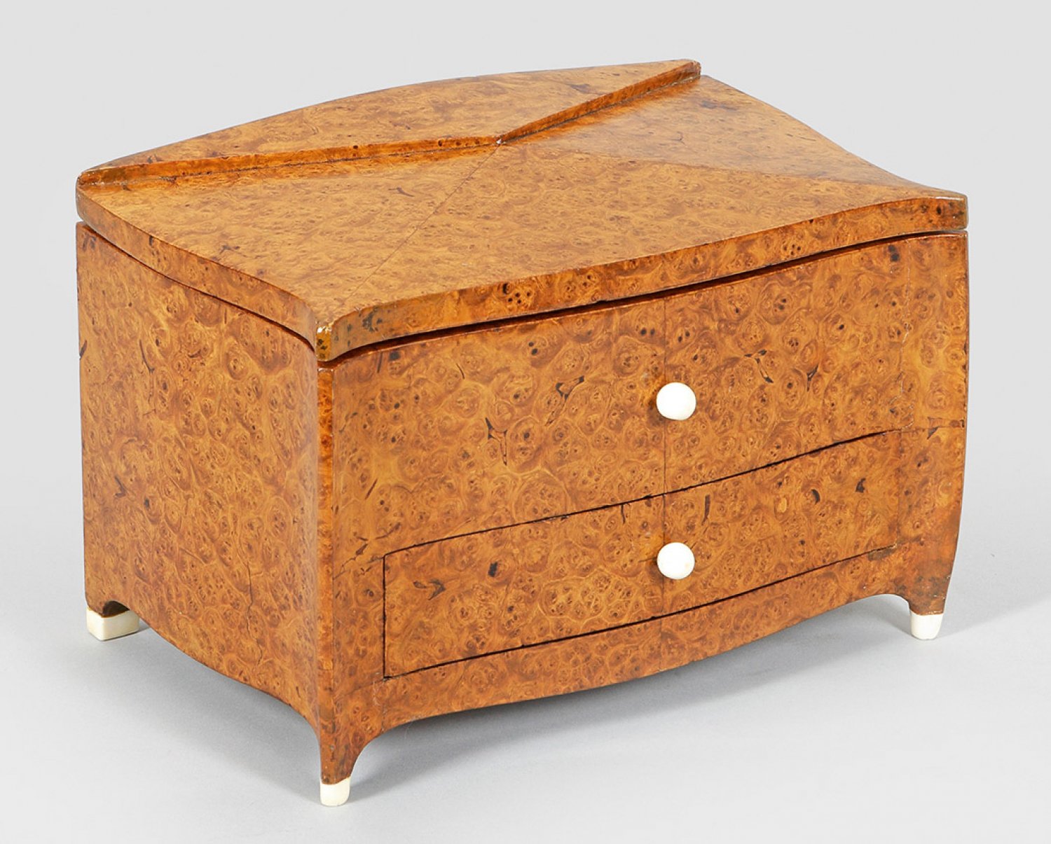 Amboinamaser, furniert sowie Bein. Dreiseitig geschweifter, querrechteckig angelegter Korpus, flankiert von schlanken, leicht ausgebogten Ecklisenen, in niedrige Füße übergehend. In der Front Schubfach mit verdecktem Schließmechanismus. Dem Korpus entsprechende, schräg ansteigende, aufklappbare Deckplatte. Unbez.; 18 cm. 26 cm x 16 cm.