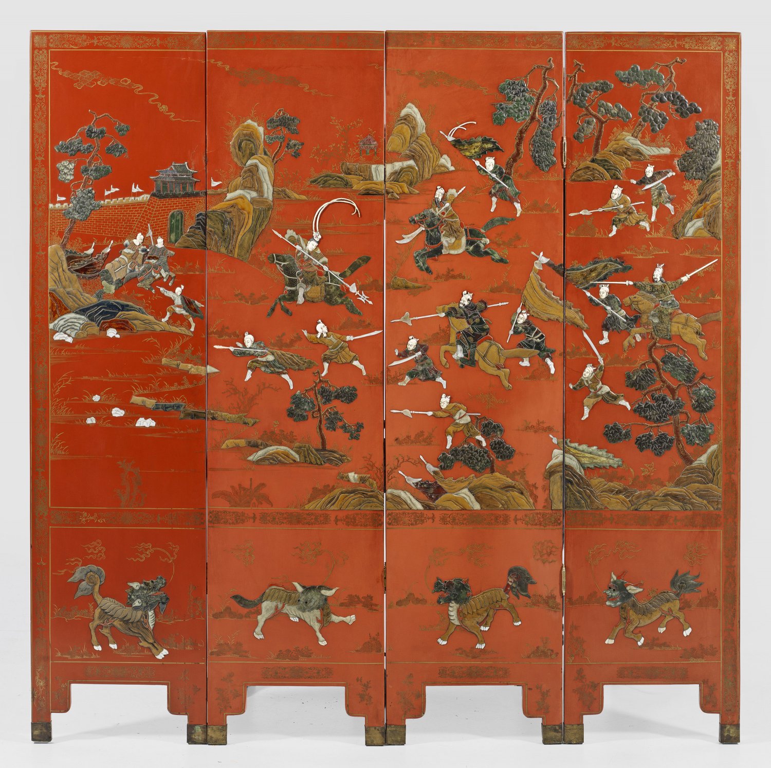 4-tlg.; Flächendeckender Fond aus Rotlack sowie goldfarbene Malerei und erhaben reliefierte Applikationen aus unterschiedlich farbigen Steinen. Schauseitig großflächig angelegte Landschaftsdarstellungen mit teilw. berittenen chinesischen Kriegern. Umlaufend schmale Ornamentbordüre sowie unterhalb vier korrespondierende Qiline. Rückseitig schwarzer Lackfond mit Golddekor aus Blüten und Schmetterlingen. Pro Paneel: 183 cm x 45 cm.