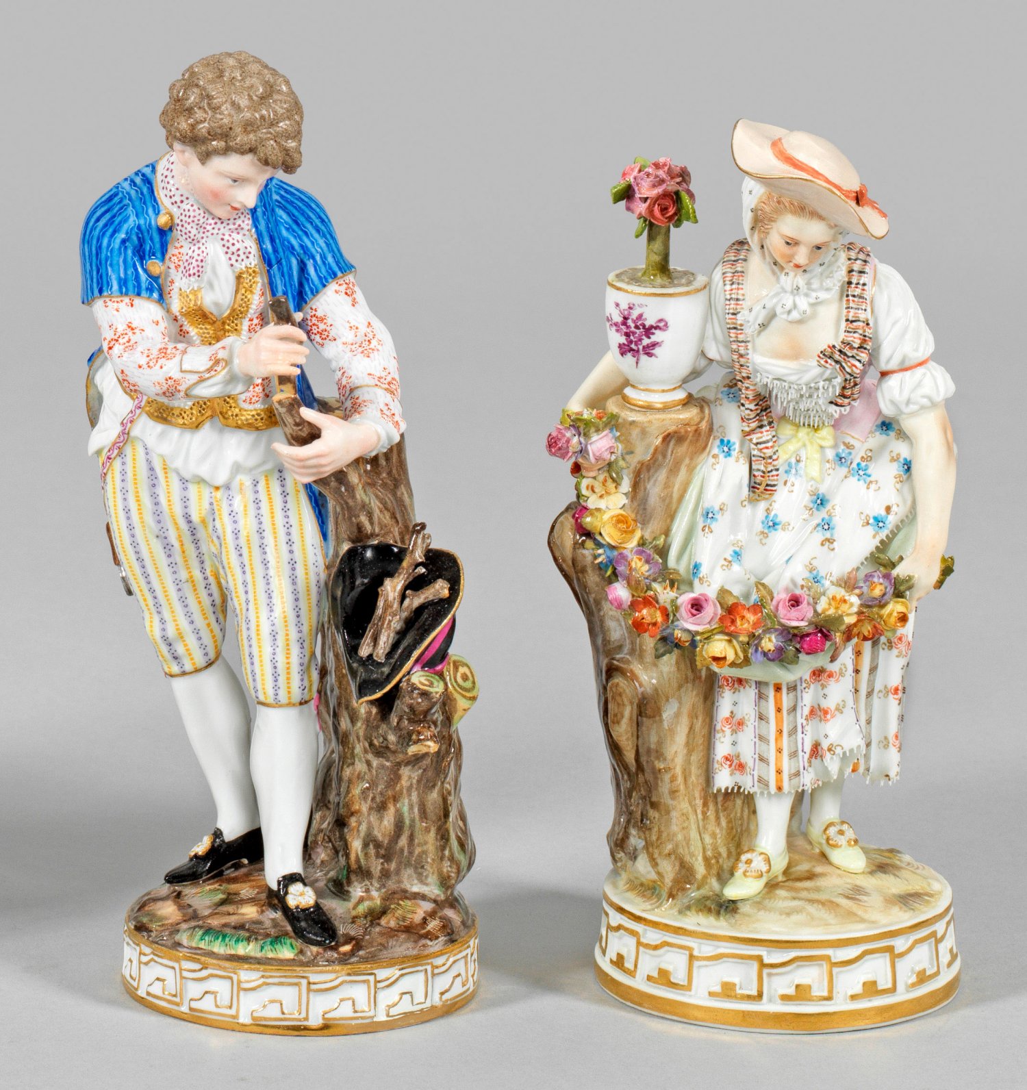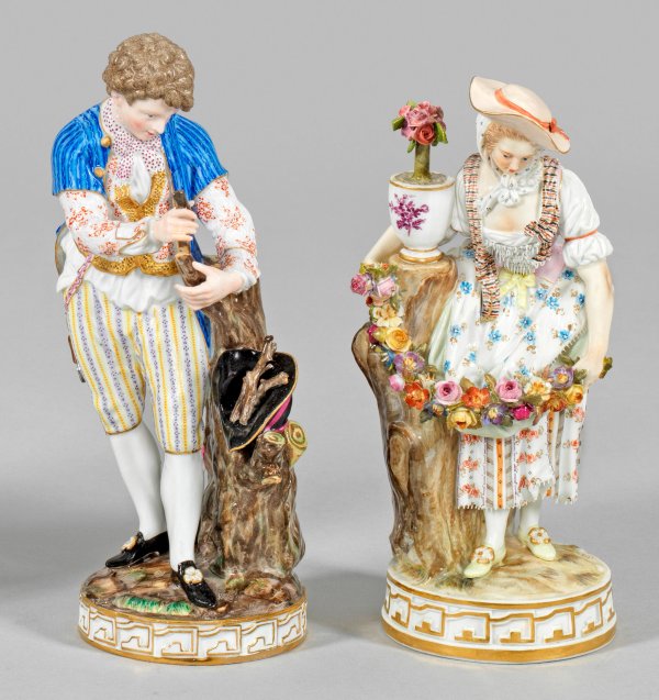 Auf rundem Terrainsockel mit reliefierter Ornamentbordüre stehender junger Herr beim Pfropfen eines Baumes bzw. junge Dame mit Blumengirlande und Rosentopf. Beide in sommerlicher Kleidung mit Spitzenputz. Polychrome Malerei mit Goldstaffage. Entw. Michel Victor Acier. Modell-Nr. F 69, F 69x. Unw. rest./best.; Schwertermarke. H. 17 cm - 18 cm.