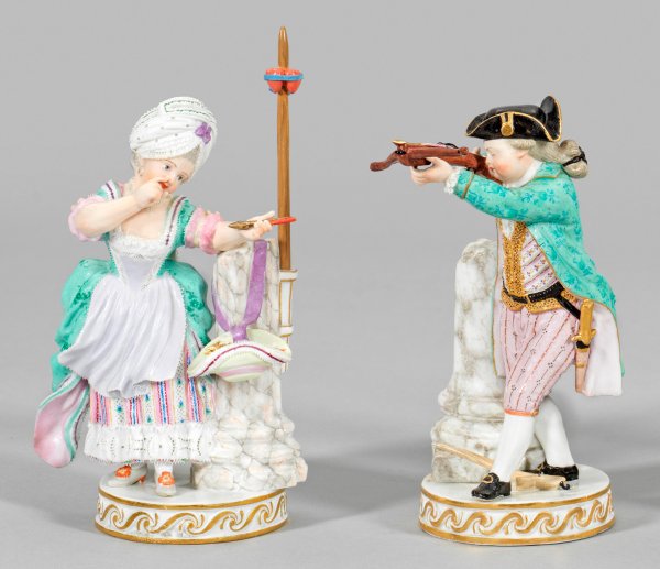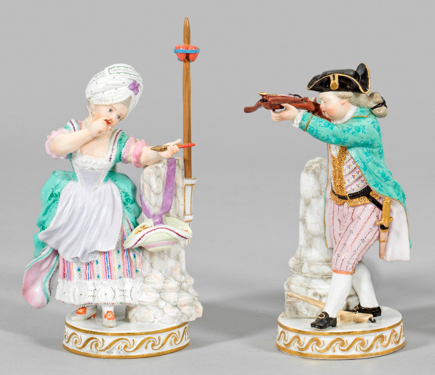 Auf rundem, ornamental reliefiertem Sockel neben einem Säulenfragment stehender Knabe als Schütze und Mädchen in edler, höfischer Rokokokleidung mit Spitzenputz, mit einer Armbrust bzw. einem Pfeil zielend. Polychrome Malerei mit Goldstaffage. Entw. Michel Victor Acier. Modell-Nr. F 32 und F 33. Unw. rest.; Schwertermarke. H. 15,5 cm - 16 cm.