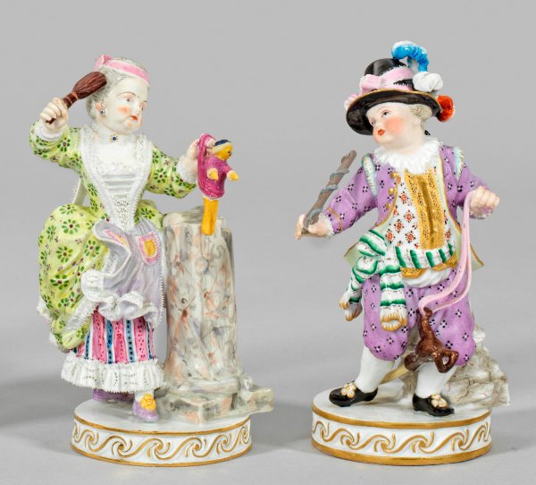 Auf rundem Sockel mit Wellenbandrelief vor einer marmorierten Säule stehender Knabe beim Spiel, in der rechten Hand eine Gerte, in der Linken die Zügel des Steckenpferdes haltend bzw. stehendes Mädchen mit Puppe und Klatsche, beide in pompöser, farbenfroher, teilw. blumig gemusterter Kleidung mit Spitzenputz. Polychrome Malerei mit Goldstaffage Entw. Michel Victor Acier/Johann Gottried Jüchtzer. Modell-Nr. E 94, E 95. Minim. rest./best.; Schwertermarke. H. 15 cm - 16 cm.
