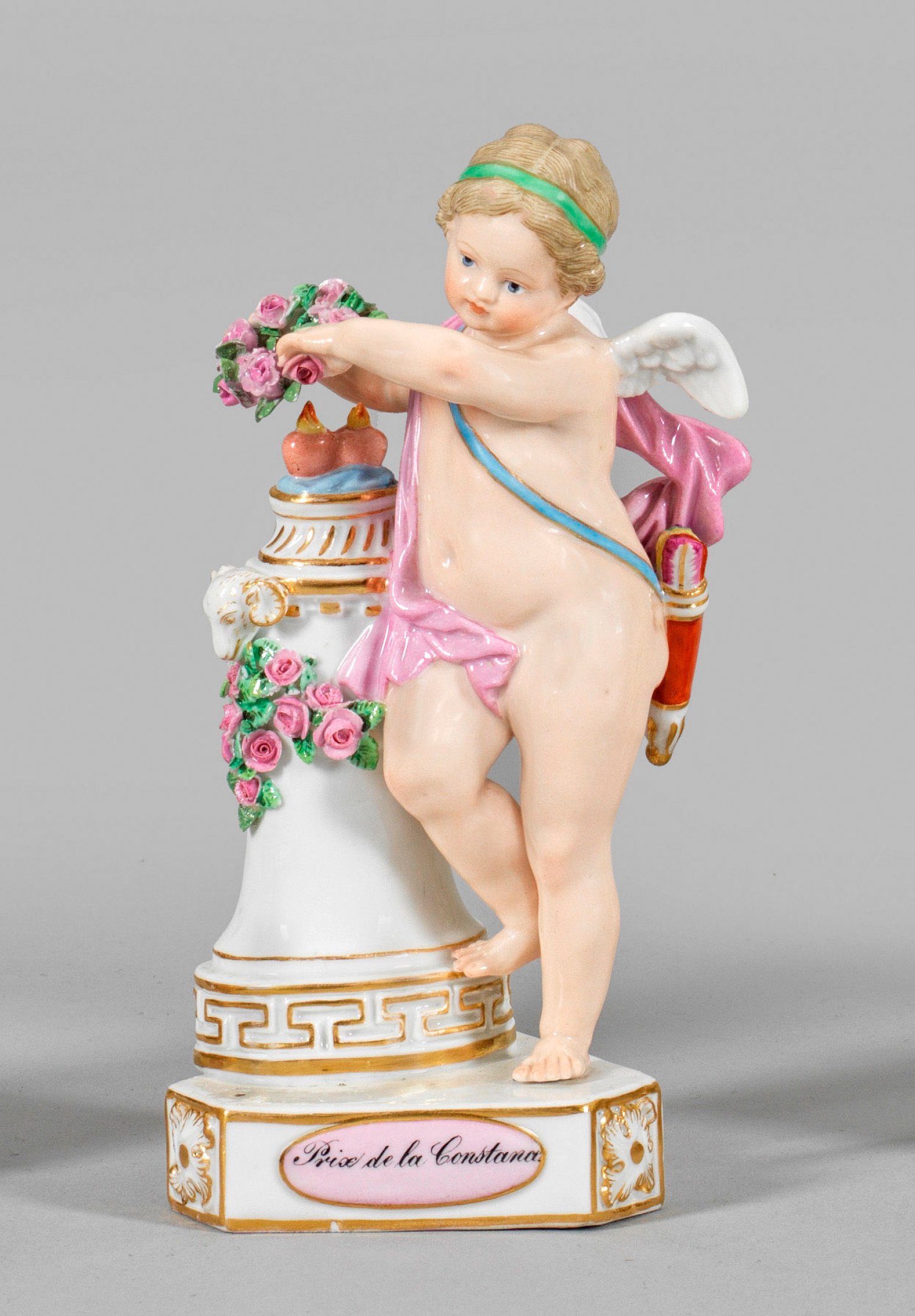 Dreiseitiger Sockel mit Rosetten, bez. "Prix de la constance". An einer Säule mit feinplastischer Rosengirlande und zwei flammenden Herzen stehende Amorette, in den Händen einen Blumenkranz haltend. Polychrome Malerei mit Goldkonturierung. Entw. Michel Victor Acier. Modell-Nr. F 3. Minim. rest.; Schwertermarke. H. 14,5 cm.