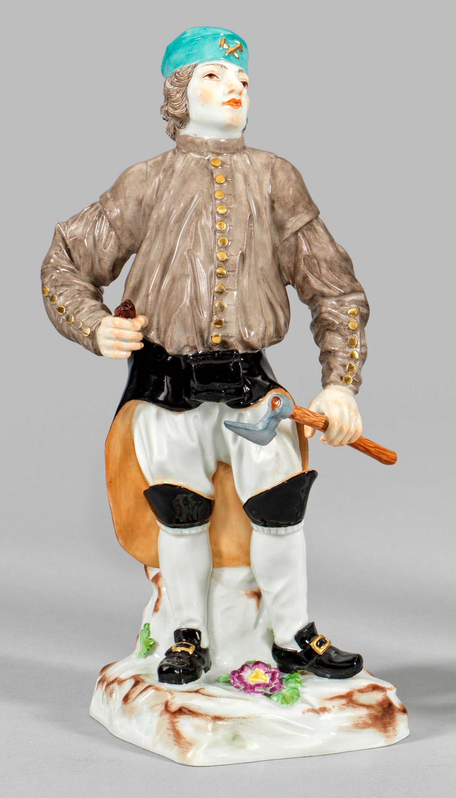 Auf einem mit Blumen belegten Felssockel stehender Bergmann in berufstypischer Kleidung mit seegrüner Kappe und goldenem Bergmanns-Emblem, in der rechten Hand einen Schlägel, in der Linken einen Häckel haltend. Polychrome Malerei mit Gold. Entw. Johann Joachim Kaendler und Peter Reinicke. Modell-Nr. 1309. Schwertermarke. H. 20,5 cm.