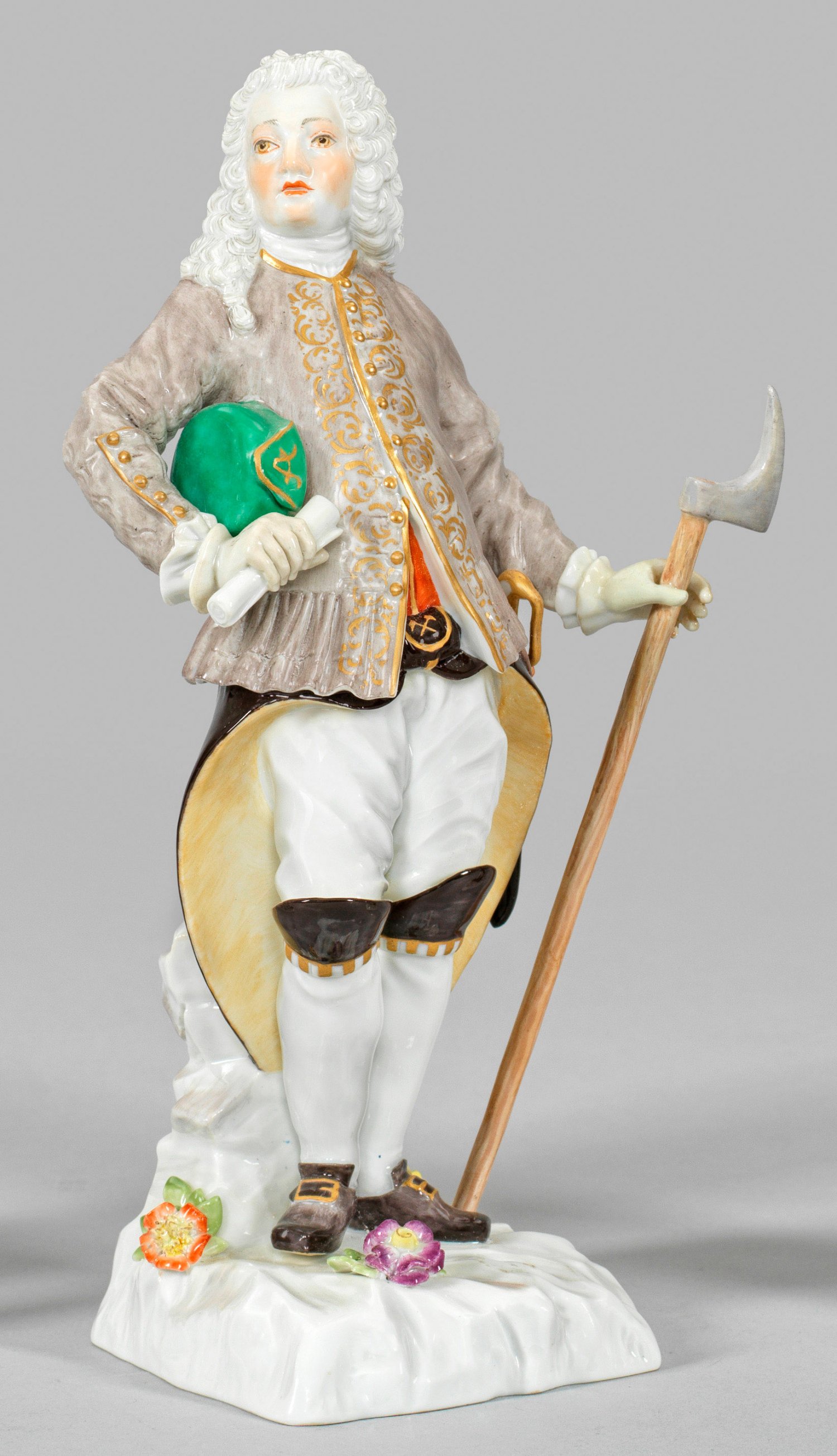Auf einem mit Blumen belegten Felssockel stehender Bergmann mit Allongeperücke in berufstypischer Kleidung mit goldornamentierter Jacke, in der rechten Hand eine Schriftrolle, in der Linken den Häckel haltend. Polychrome Malerei mit Gold. Entw. Johann Joachim Kaendler und Peter Reinicke. Modell-Nr. 69514. Minim. rest.; Schwertermarke. H. 21,5 cm.