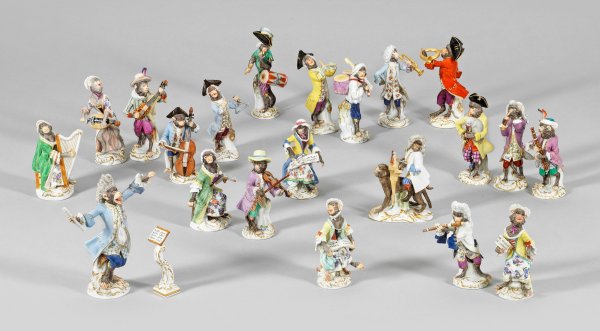 A complete 22-piece collection of porcelain figures from the "monkey orchestra" modelled by J. J. Kaendler and P. Reinicke. One female singer dated after 2000. Drummer minor restored. Crossed swords mark.