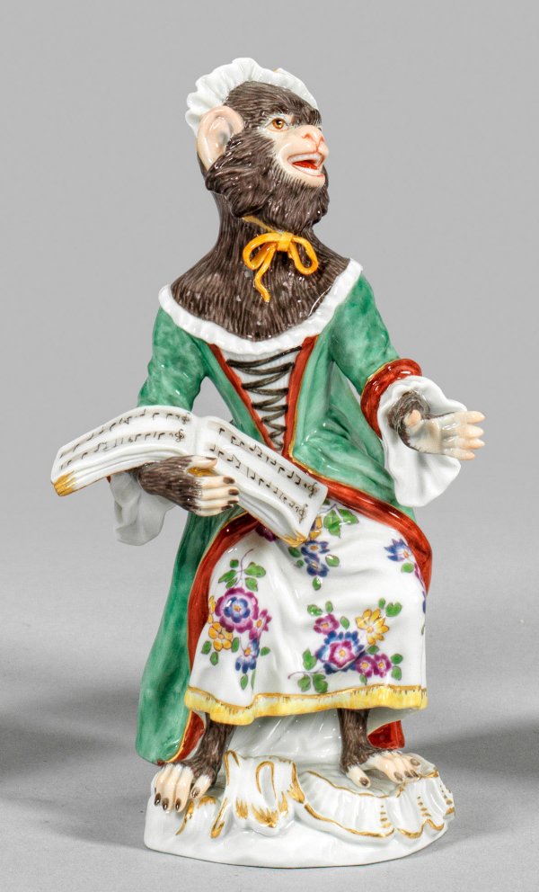 Auf rocaillereliefiertem Sockel stehende Affenfrau als Sängerin. Polychrome Malerei mit Goldstaffage. Entw. Johann Joachim Kaendler und Peter Reinicke. Modell-Nr. 60018. Schwertermarke. H. 12,5 cm.